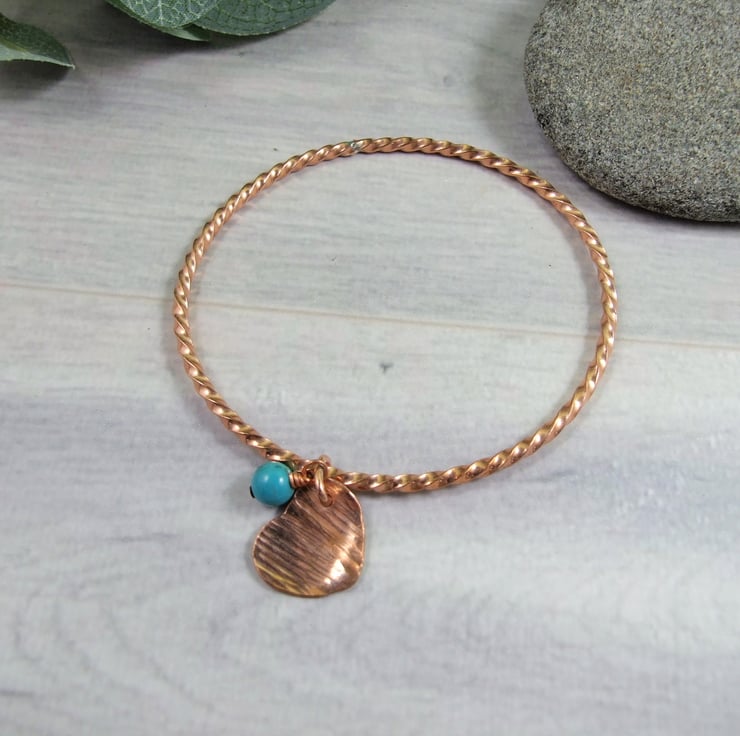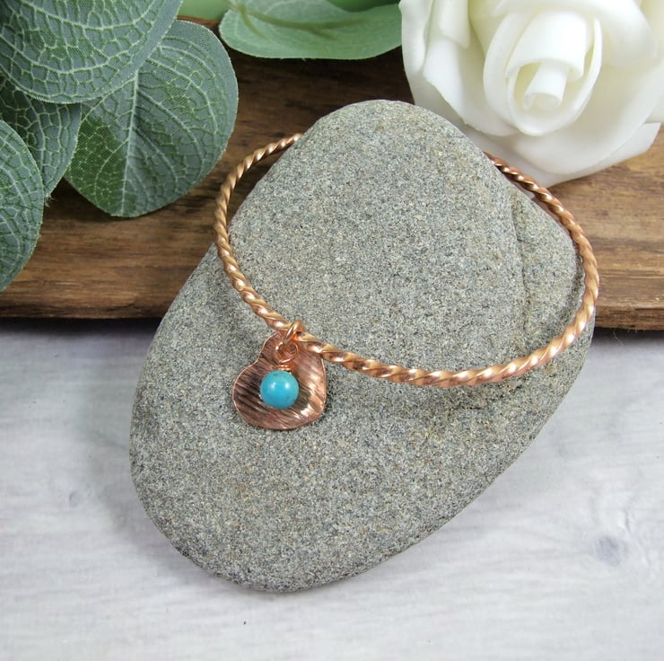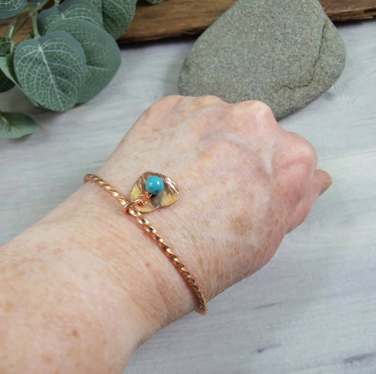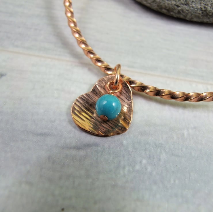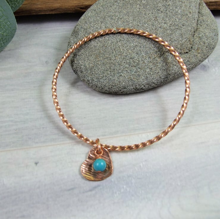 Copper Bangle with Heart Charm and Turquoise Gemstone. Size medium 7.8 inches circumference 2.5 inch diameter (see size guide photograph)