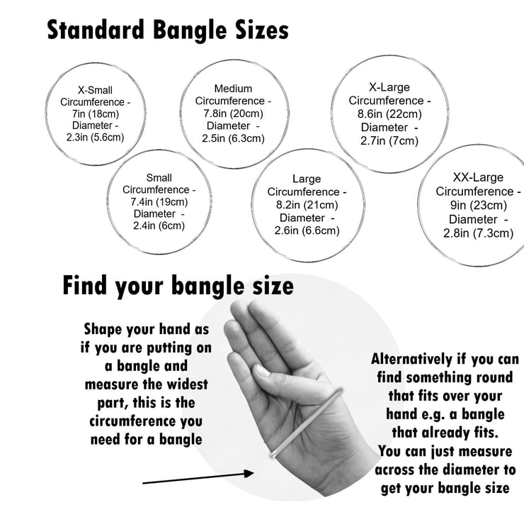 To check your bangle size just tuck your thumb in and measure around the widest part of your hand just below your knuckles. If you don't have a flexible tape you can use a strip of paper, mark for your size and then measure the paper against a ruler.