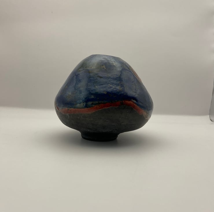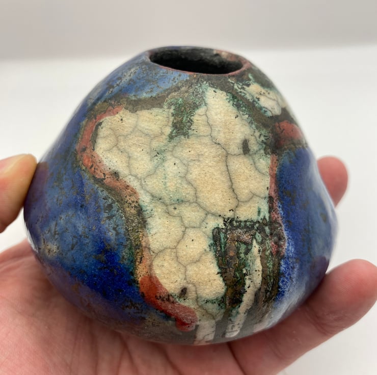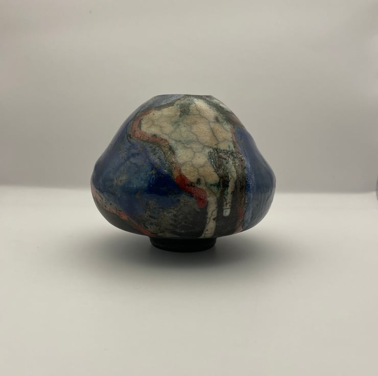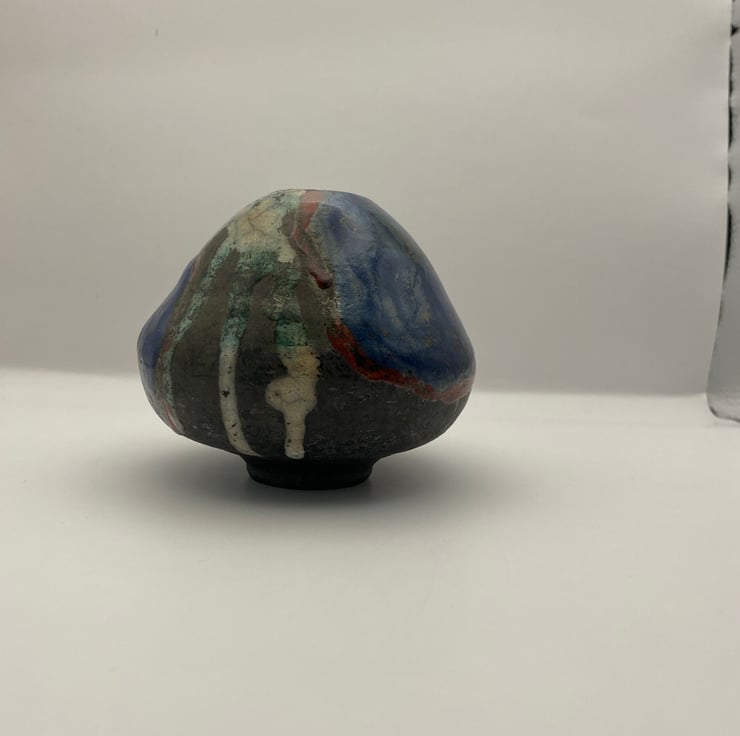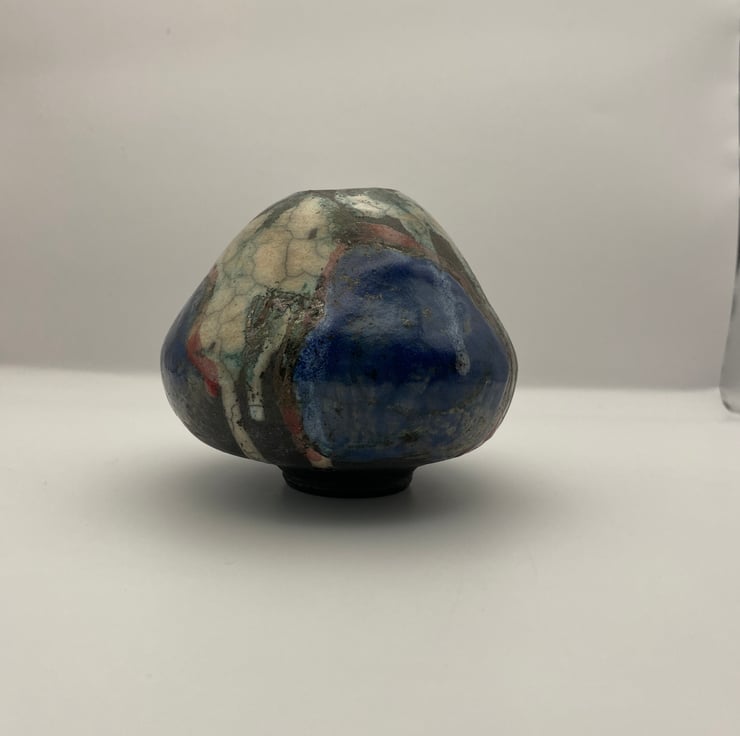 The pot was created by wheel-throwing, bisque firing, and then decorating with underglazes, glazes, and oxides. The vessel was taken from 2nd firing process while it was glowing red hot and then placed in a combustible material - sawdust, and newspaper. The vessel was starved of oxygen, which creates a myriad of colours within the glaze and then quenched in water.