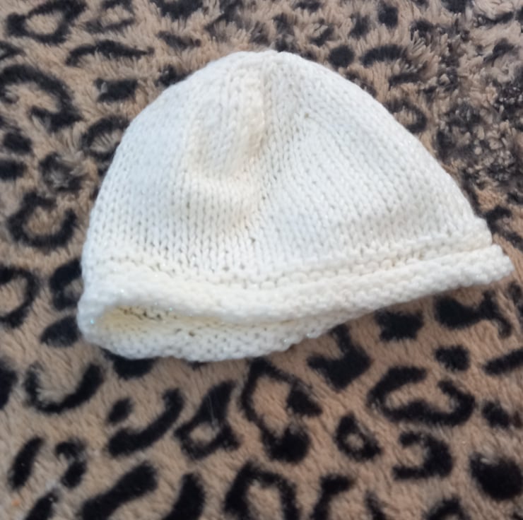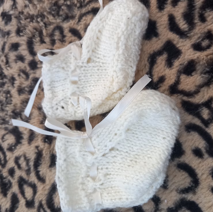 Hand knitted baby beanie hat and matching booties to fit 0-3 months. This set is in cream acrylic yarn. Can be custom made in other colours and sizes. Please message me for details.