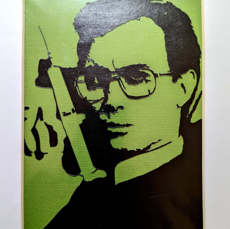 hand-cut paper art of Lovecraft's mad scientist, Herbert West as portrayed by Jeffrey Combs in the film, Re-Animator. This is a mounted papercut created from a single piece of black paper, mounted over a green background and ready to be framed.