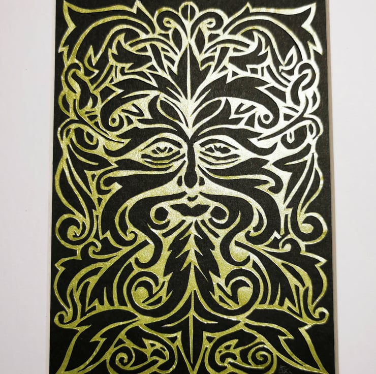 Green Man design, hand cut from metallic green paper and mounted over black.