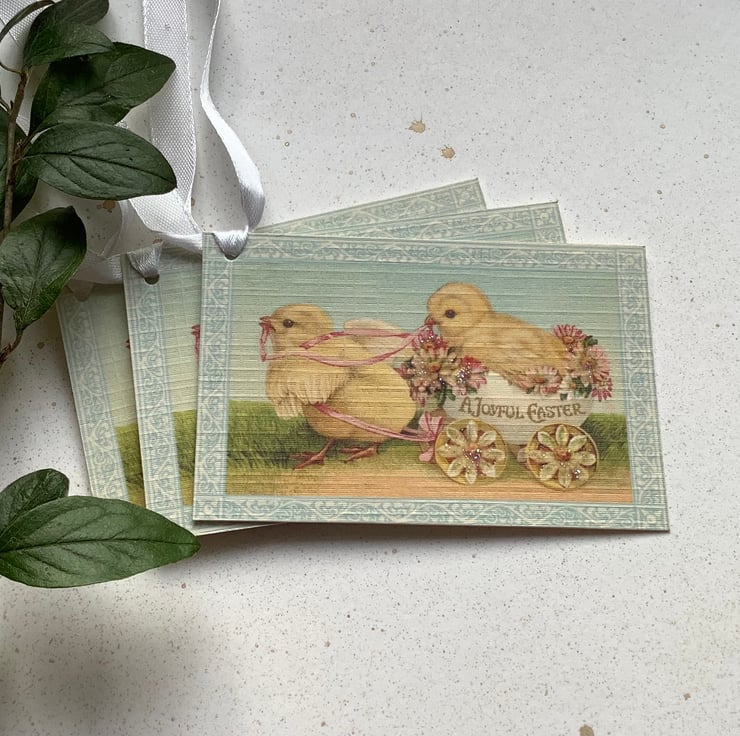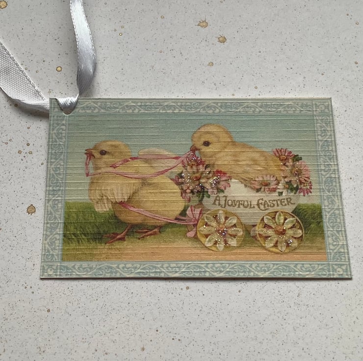 Lovely vintage image of two Easter chicks in a flower-filled wagon ! So sweet !I have printed on to high quality linen-look (285gsm) card . Of course there has to some shimmer! and so I have added the necessary ink and glitter .Finished with lovely ,silky ,vintage -style ribbon !!