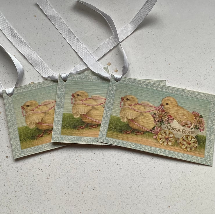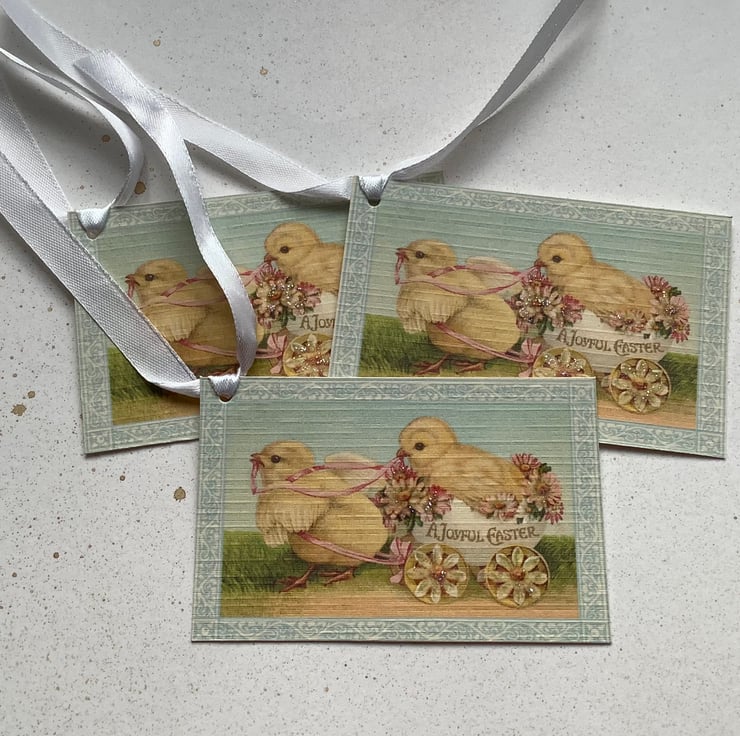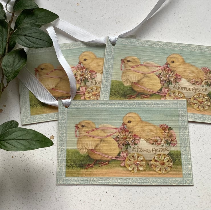 You will receive three tags with the same image ( as pictured ) . The wording on each reads .' A Joyful Easter '