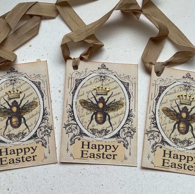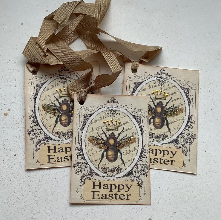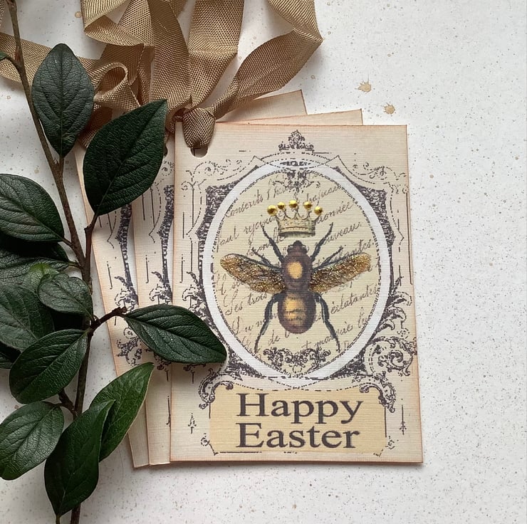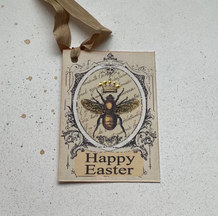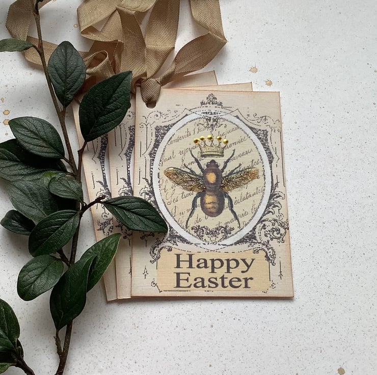 Lovely vintage image of a Queen Bee on script background, with the wording 'Happy Easter' .I have printed on to high quality linen-look (285gsm) card . Of course there has to some shimmer! and so I have added the necessary ink and glitter . Tied with elegant ,silky ,vintage -style ribbon !!