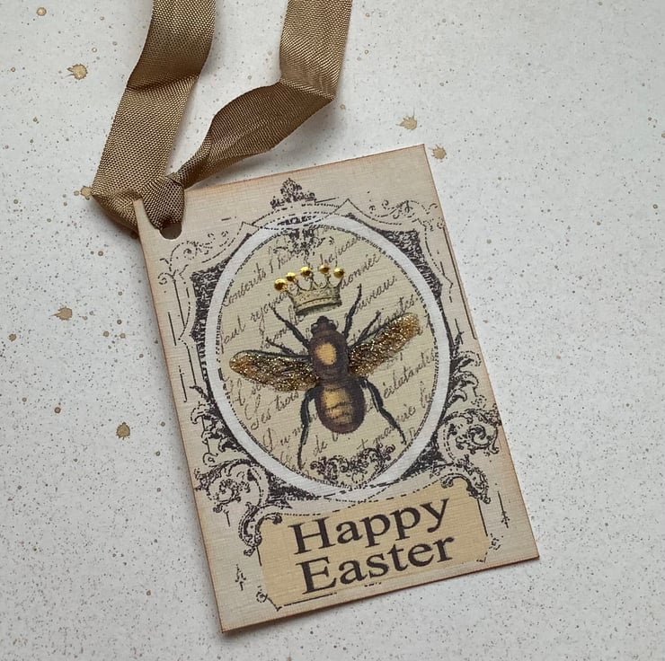 COLOURS: Brown bee on natural beige background . Gold dots on crown and holographic gold on wings . The edges have been 'aged' with sepia ink . The ribbon is 'Old Gold' .