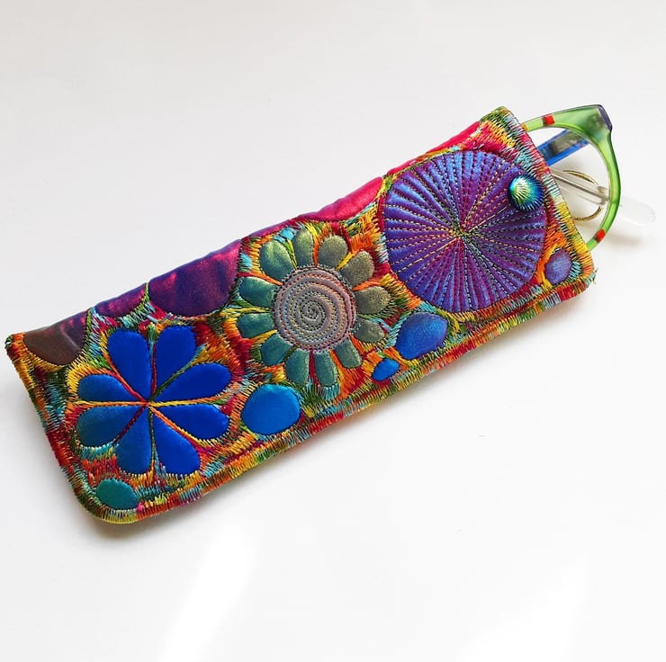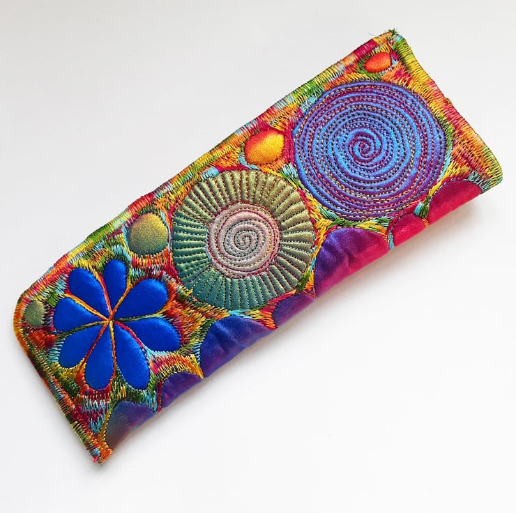 Made from layers of fabric including hand dyed Egyptian cotton an d silk fabrics using the free machine embroidery.
