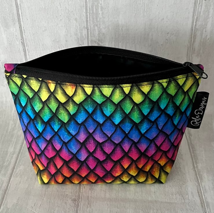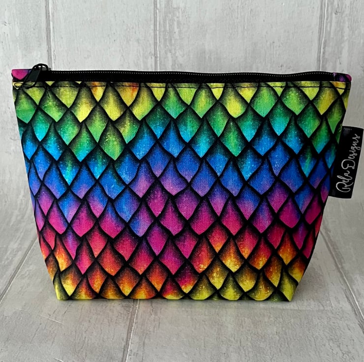 This colourful dragon scales print cotton zipped pouch has a black waterproof nylon lining , great for those inevitable spills.