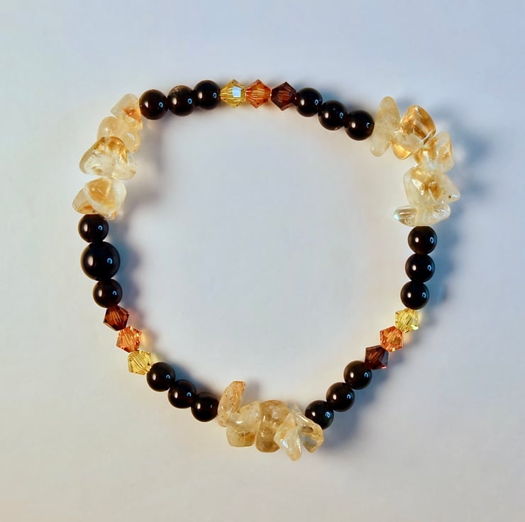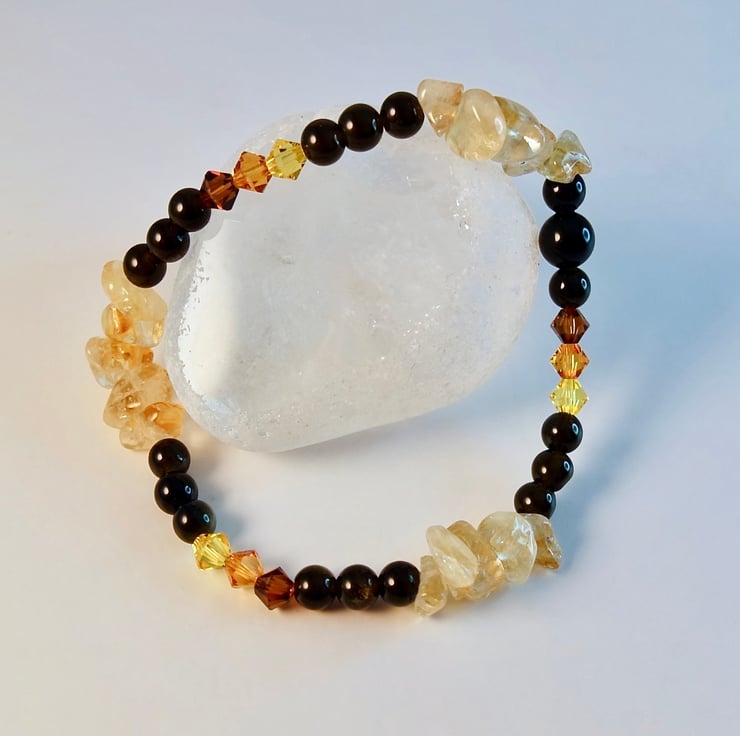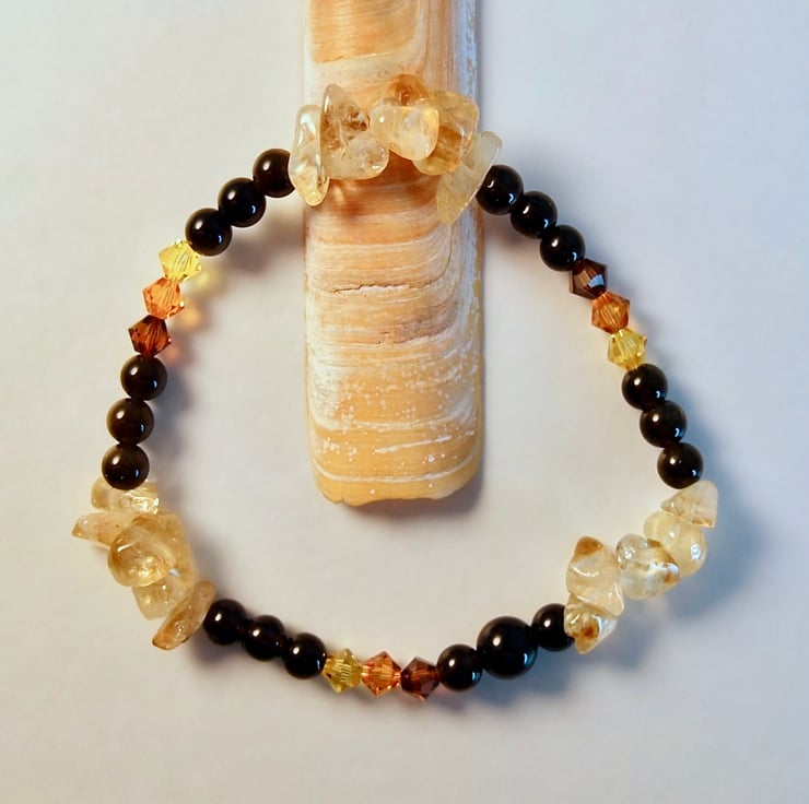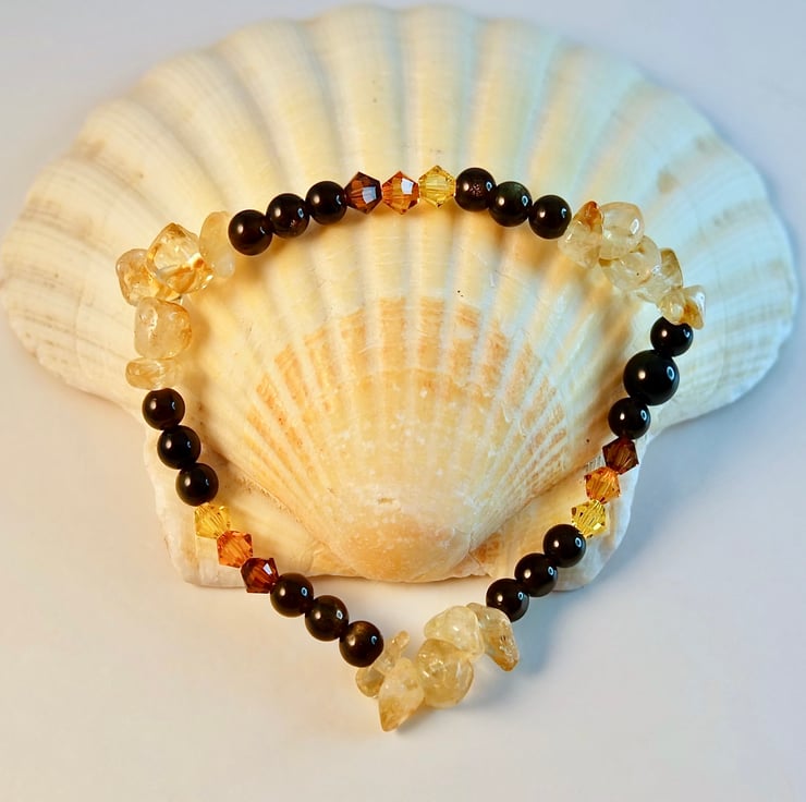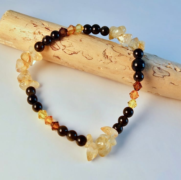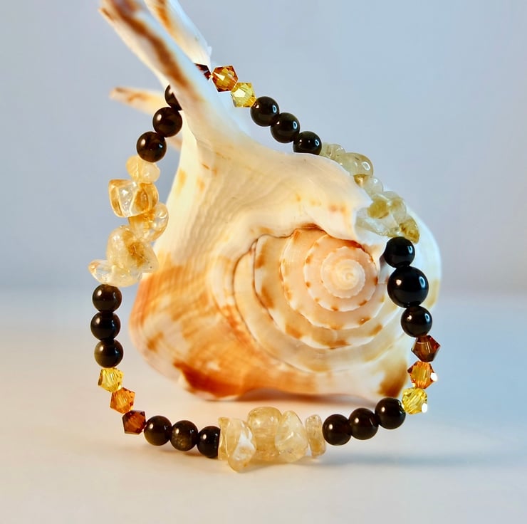 Pretty bracelet comprised of clusters of five pale yellow citrine nuggets, 4mm obsidian beads and sparkly Swarovski crystals in the colours 'topaz' and 'light topaz and 'smoked topaz'.