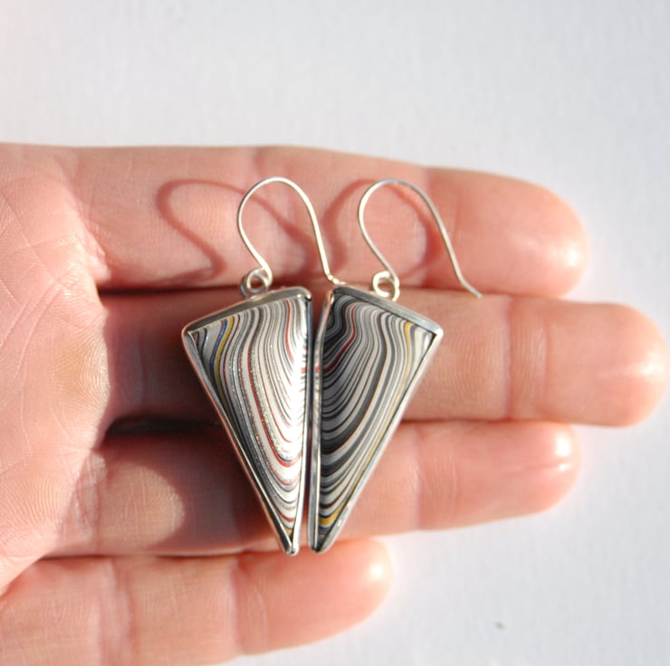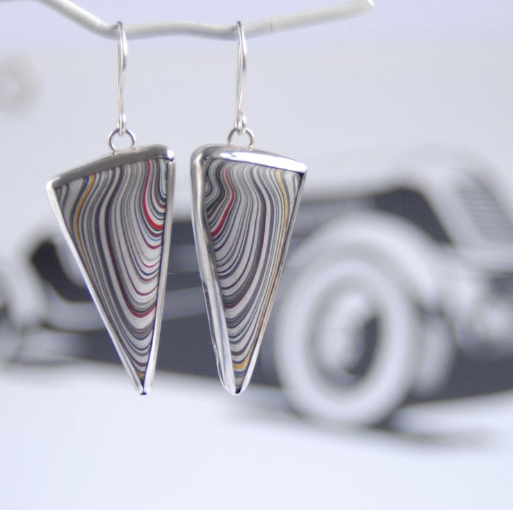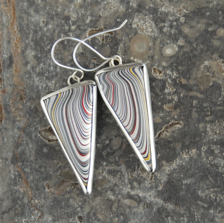 These elongated triangular earrings feature striped fordite bezel set in sterling silver and finished with simple silver hooks. The fordite is predominately off - white with bands of silver, yellow and red, some of the colours sparkle in the light but it is a subtle effect. They measure 52mm (from top of hook) by 17mm across, fordite is lightweight so comfortable to wear all day.