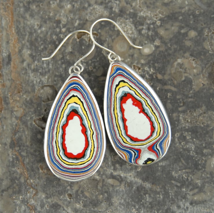 These statement earrings feature large drops of colourful fordite which has been bezel set in sterling silver, the earrings have been finished off with simple sterling silver hooks. The fordite has a pattern of concentric rings in shades of blue, white, red, yellow and silver, the drops almost match. These fordite earrings measure approx 57mm from top of the hook to the bottom of the drop by approx 23mm wide so they are big and eye catching but fordite is light weight so they could be comfortably worn all day.