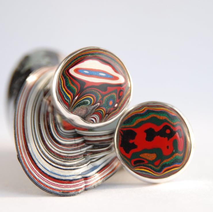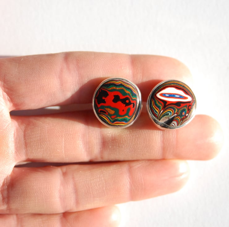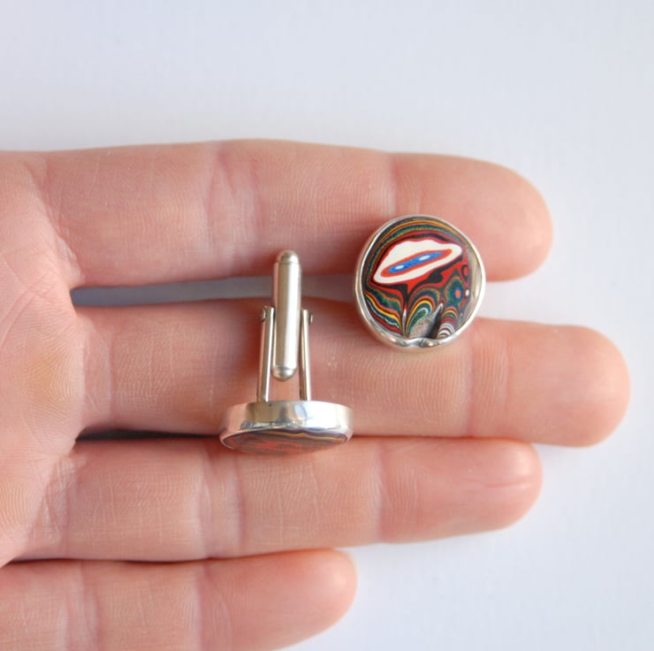 hese sterling silver cufflinks feature rounds of multi coloured fordite from the Kenworth truck factory. The fordite is bezel set in sterling silver and the cufflinks finished with standard sterling silver swivel backs for ease of use. The fordite aren't a perfectly matched pair but were cut from the same bit of rough so the colour palette is the same, there is black, red, deep green, sparkly copper, emerald and blue. One of the pieces of fordite has a splodge of white with red and blue streaks which reminds me of a UFO, this also has an indentation from a dribble in the original rough. The cufflinks measure approx 19mm across with standard swivel backs.