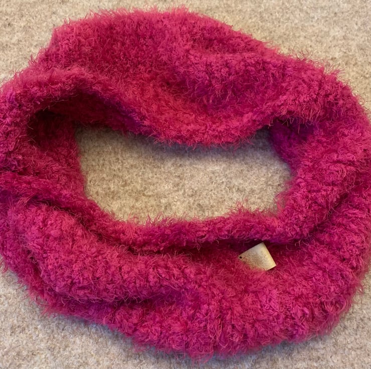 A hand knitted super soft snood knitted in Sirdar Touch yarn. Ideal for adding just a little colour and keeping your neck warm. Soft and snuggly and is not bulky.