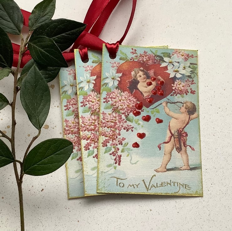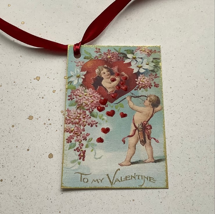 Lovely vintage, images of cupid / cherubs , florals and love hearts . I have printed on to high quality linen-look (285gsm) card . Of course there has to some shimmer! and so I have added the necessary ink, glazes and glitter .Finished with lovely ,silky ,vintage -style ribbon !!