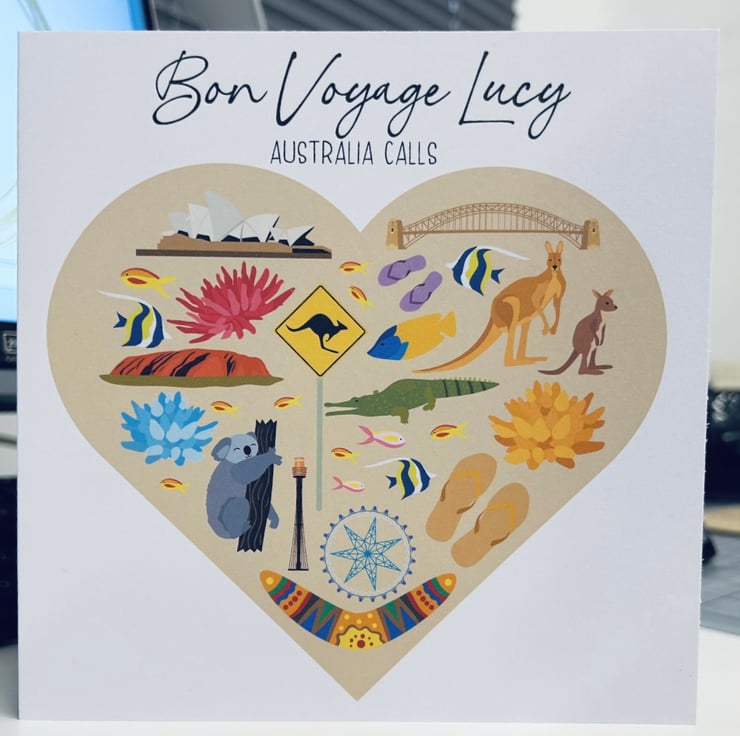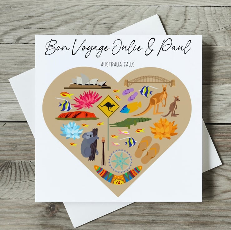 This card is sized 6” x 6” and is left blank inside unless otherwise required. Handmade to order these cards can be personalised with the name or names of your choice and this design is perfect to send anyone going to Australia