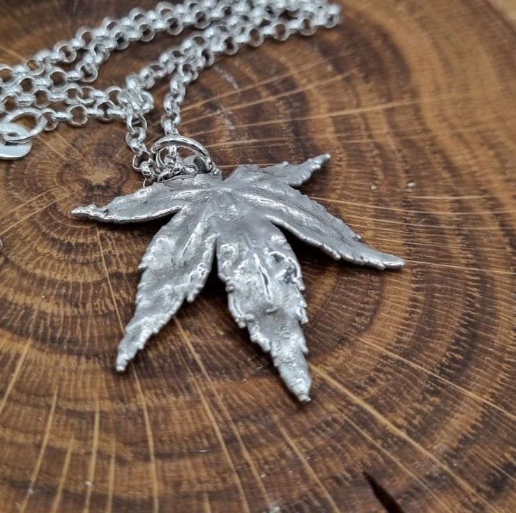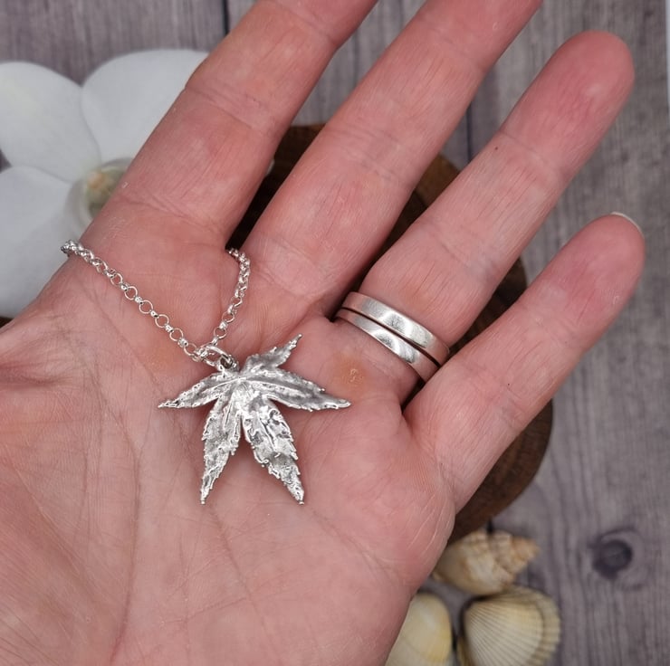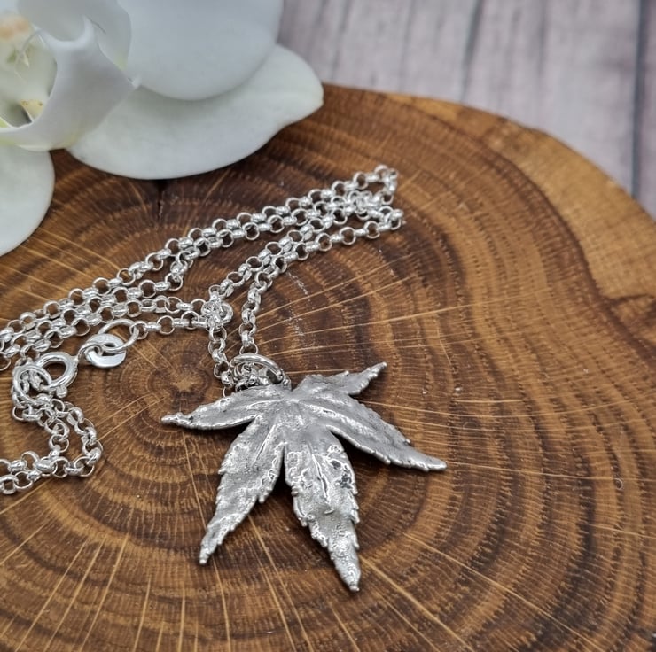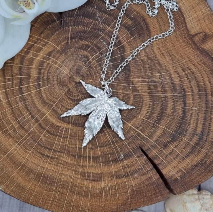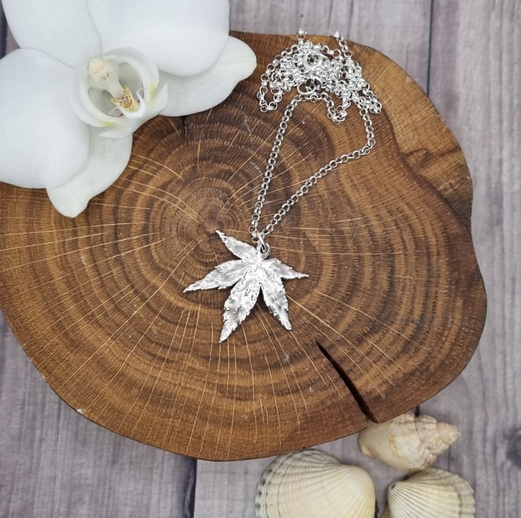 This Acer (also known as Japanese Maple) leaf measure approximately 3cm high and is supplied on an 18 inch sterling silver necklace chain, different styles and length of chain can be supplied on request, please message me for a quote.