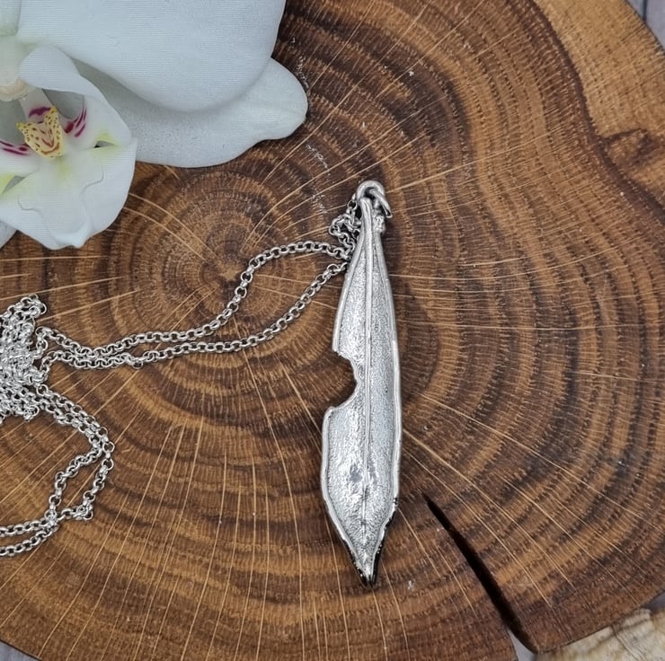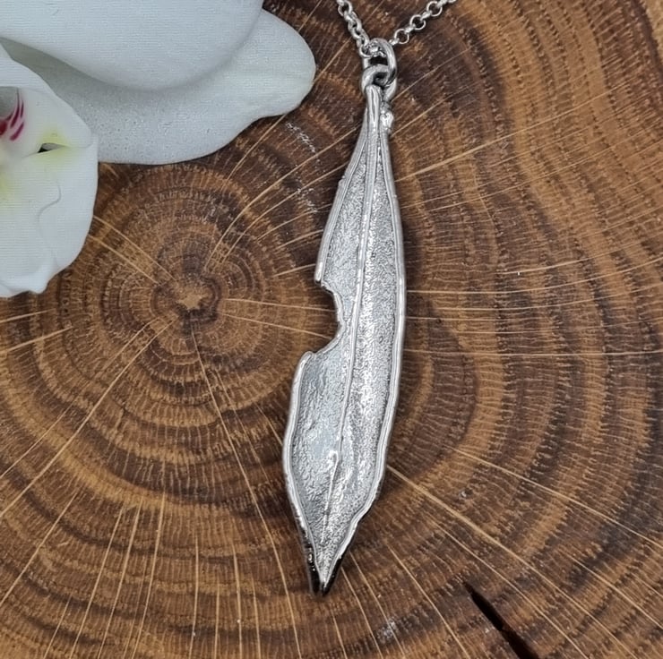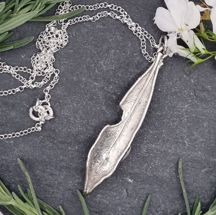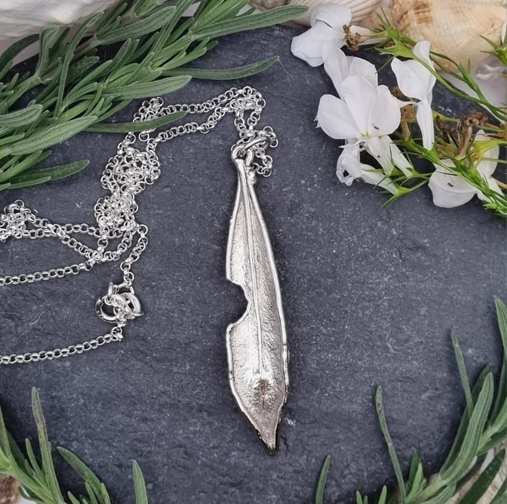 Something had taken a cheeky nibble out of this lovely olive leaf but I couldn't resist coating it anyway! It measures approximately 5.4cm high and is supplied on an 18 inch sterling silver necklace chain, different styles and length of chain can be supplied on request, please message me for a quote.
