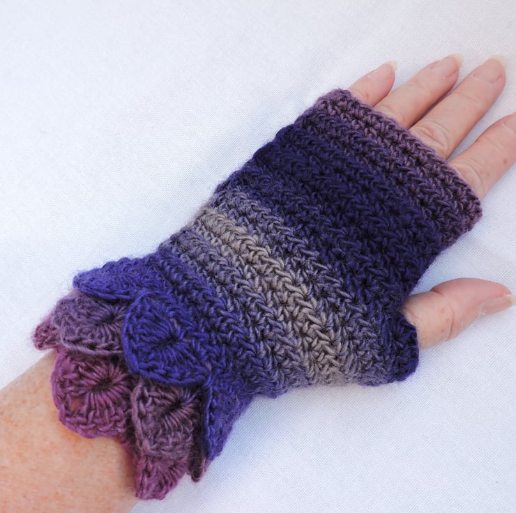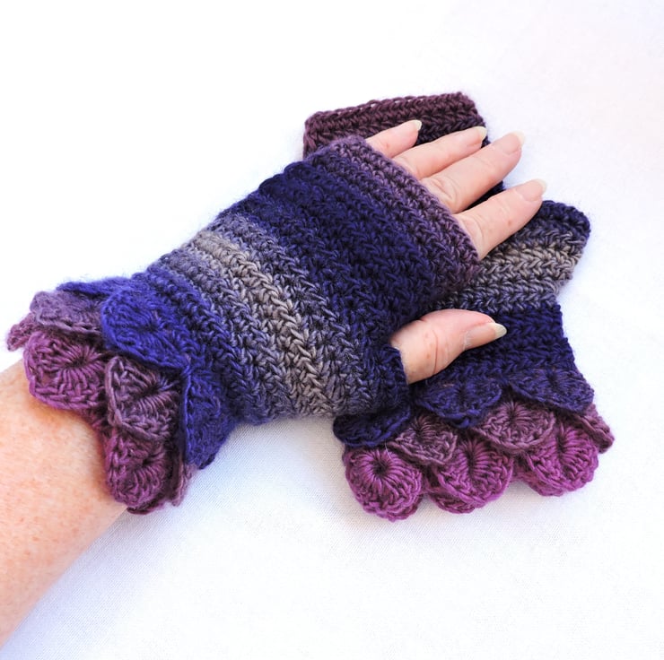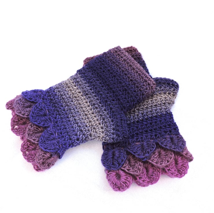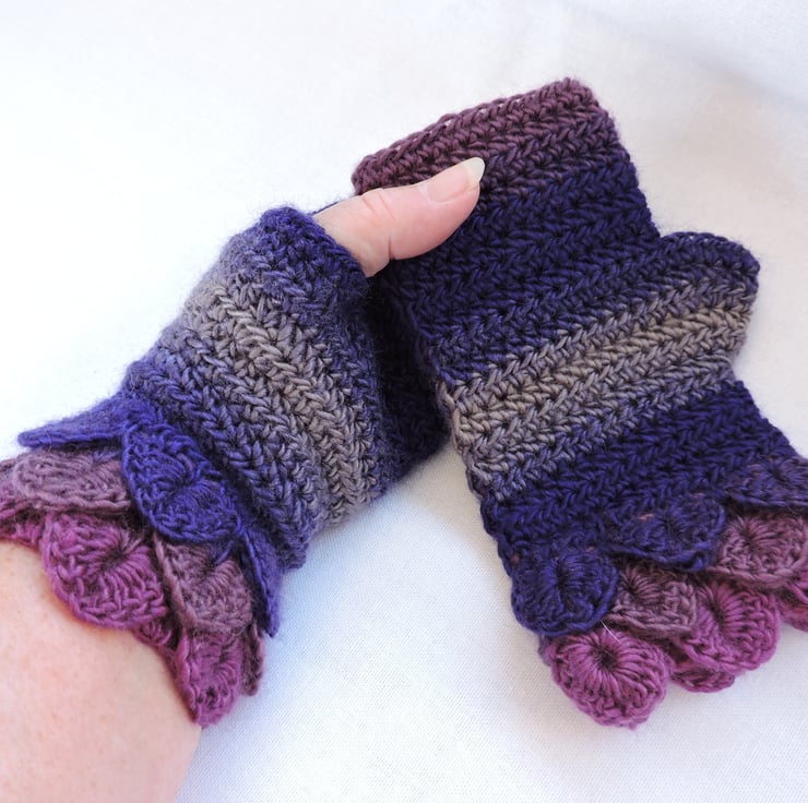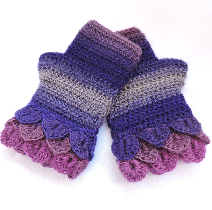 Sale Fingerless mittens with dragon scale cuffs crocheted in a double knit self striping acrylic and wool yarn. Colours graduating through pink, mauve, purple, grey and clover. These mittens have three layers of dragon scales at the cuffs and a plain body. Warm and cosy, ideal for the cold weather