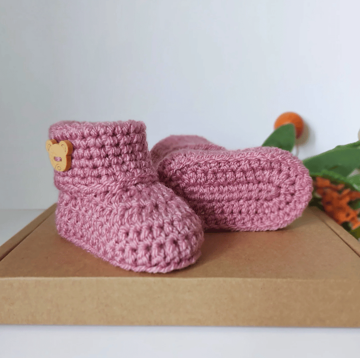 Discover these adorable crochet baby booties finished with a teddy button, lovingly hand-made and ideal for gifting at baby showers.