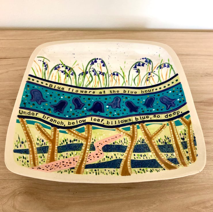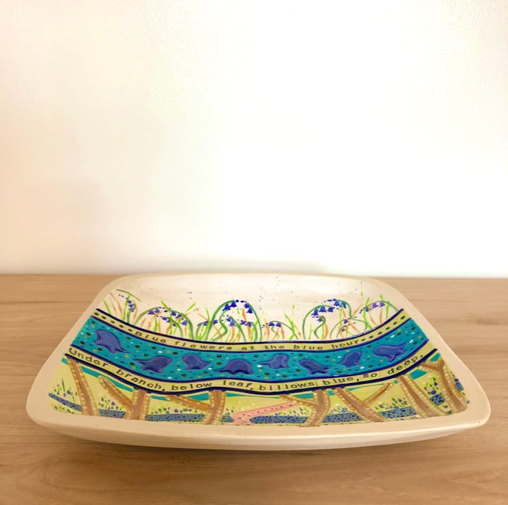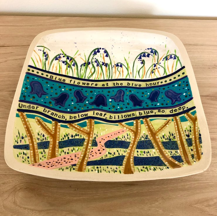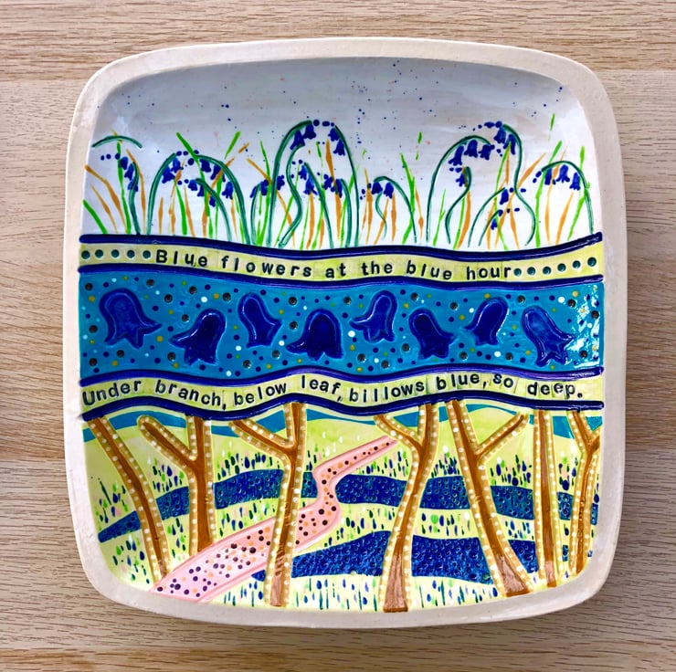 Once cool I painted the bluebell design using coloured underglazes and finished it off with a shiny clear glaze. The underside is left plain (save for my maker’s mark) and unglazed.