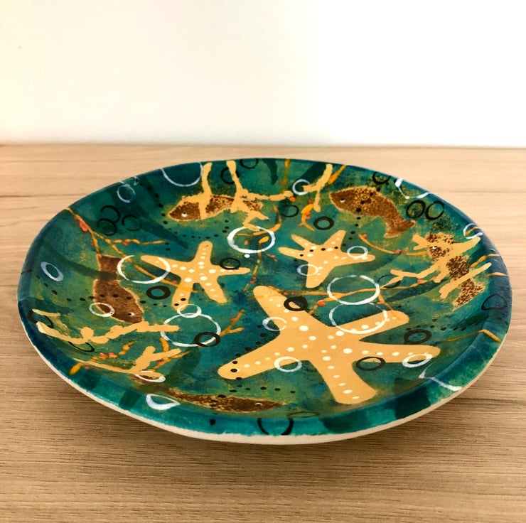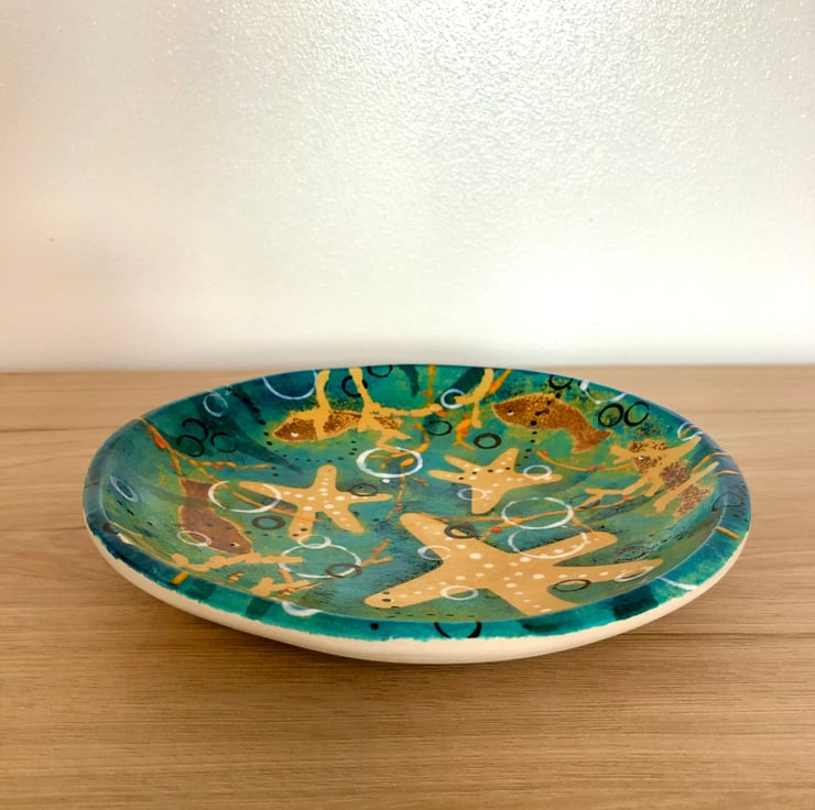 I took my inspiration for this stoneware ceramic plate design from spuddling about in Cornish rock pools. The design is painted with underglazes and I’ve used homemade paper stencils and a range of tools to make different marks. The front of the plate is finished off with a coat of shiny clear glaze and the back is left unglazed.