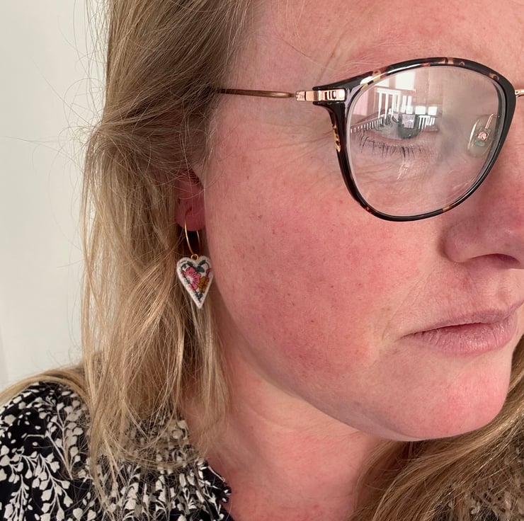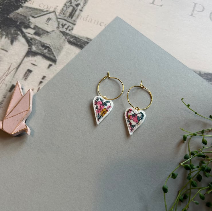 Heart earrings embroidered using the liberty print of your choice which is then stitched onto felt.