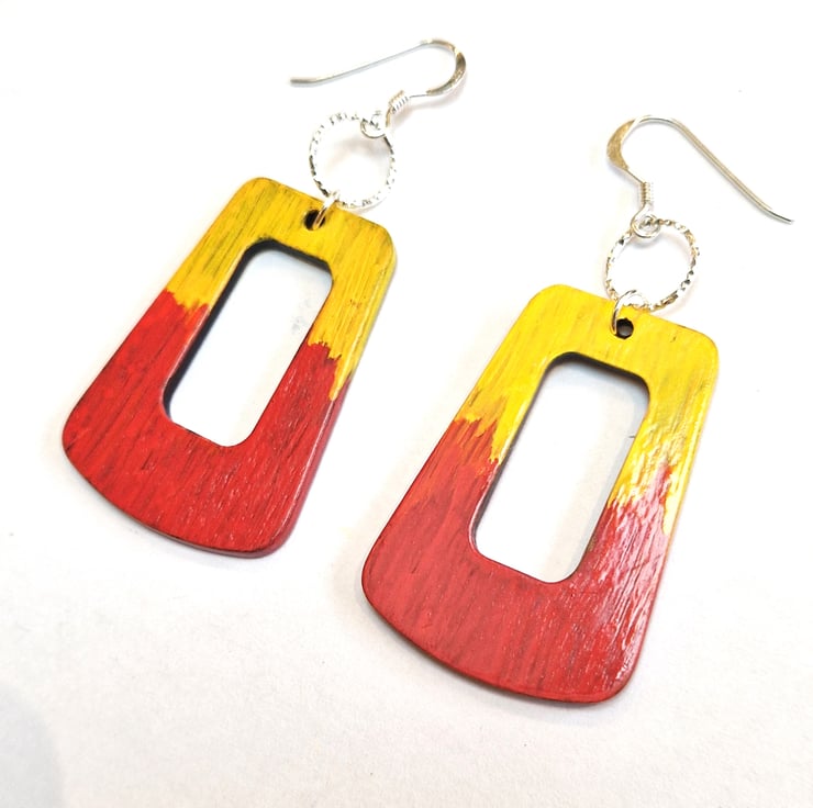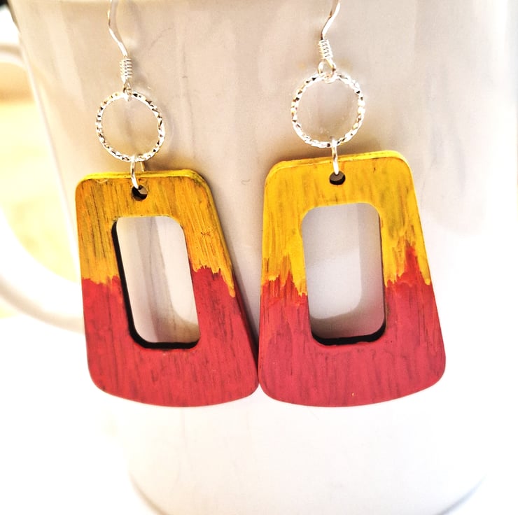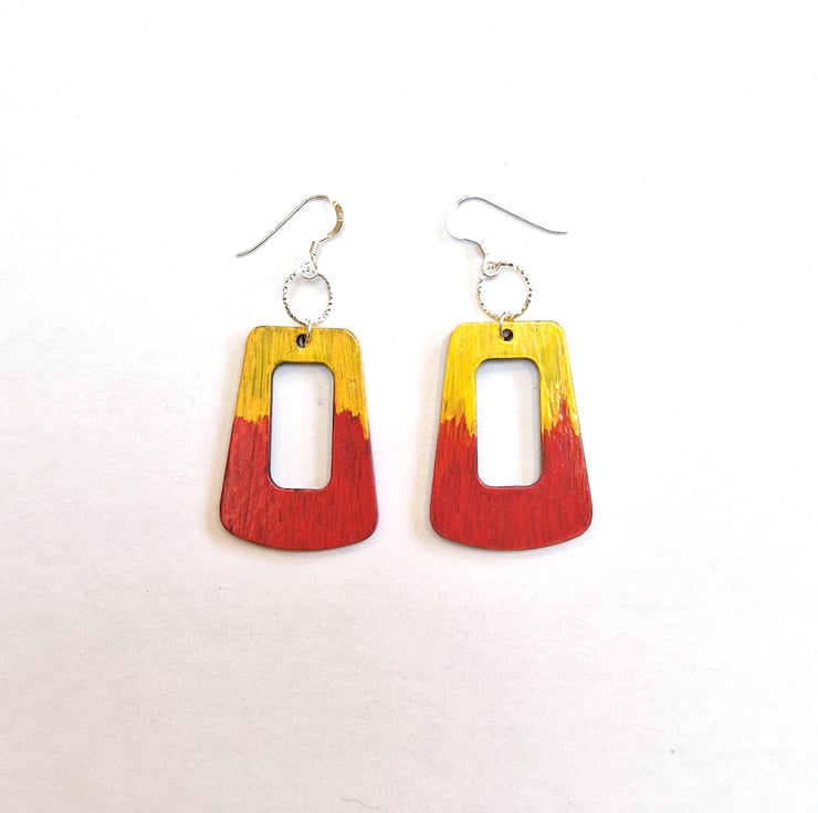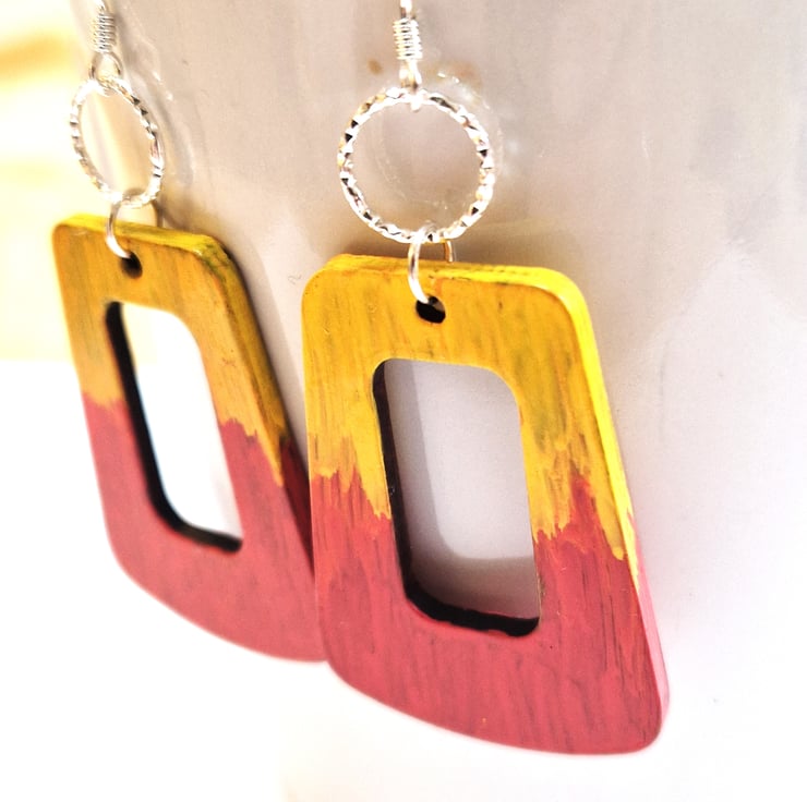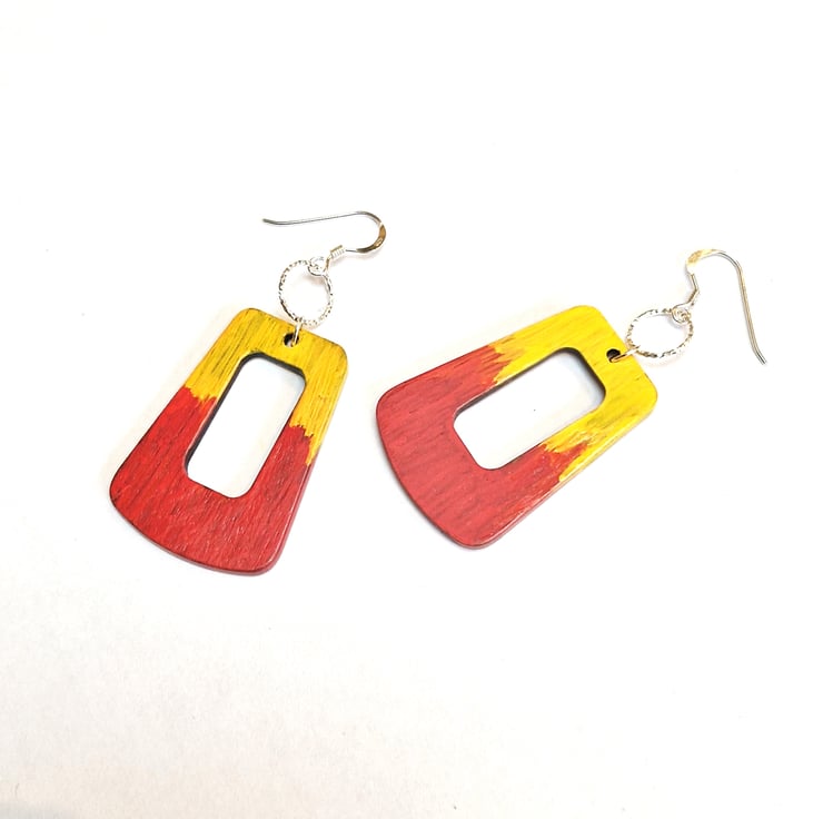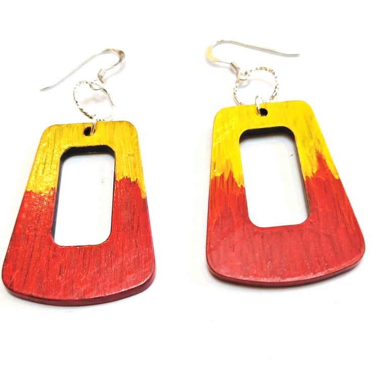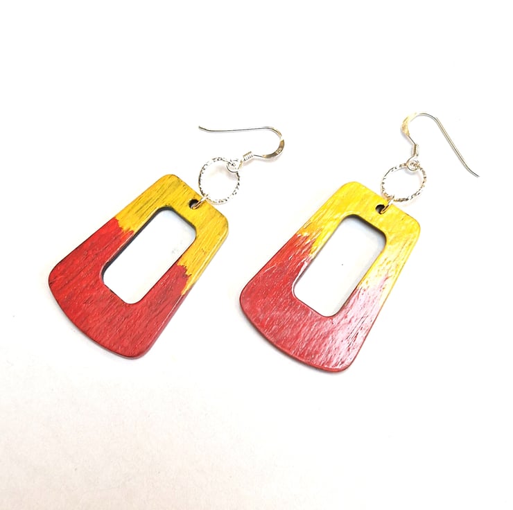 These earrings are painted with a red and yellow abstract design with a rustic feel. Each earring is a little different which reflects its handmade nature. The painted wood is a trapezium shape with a centre cut out and decorative sterling silver ring above; connecting to the ear wires.