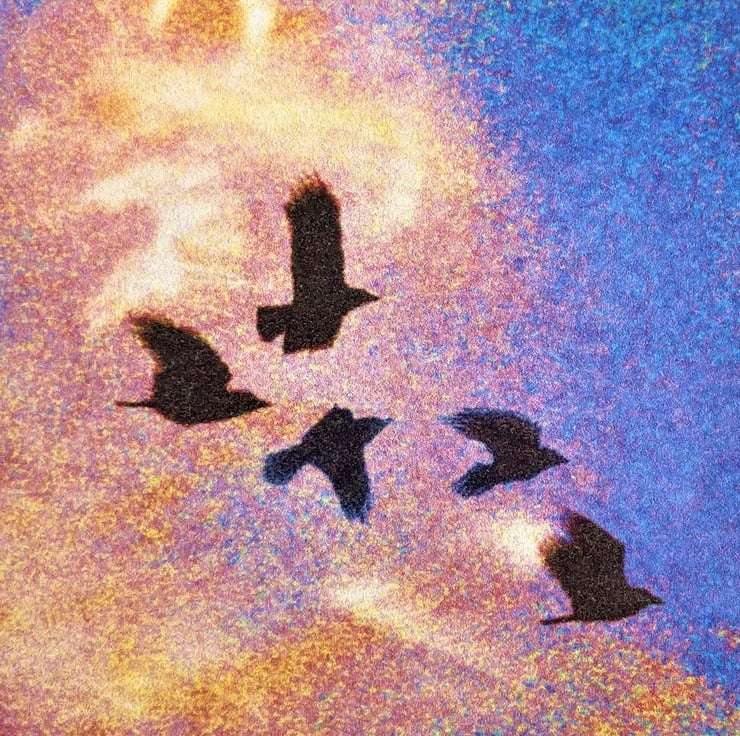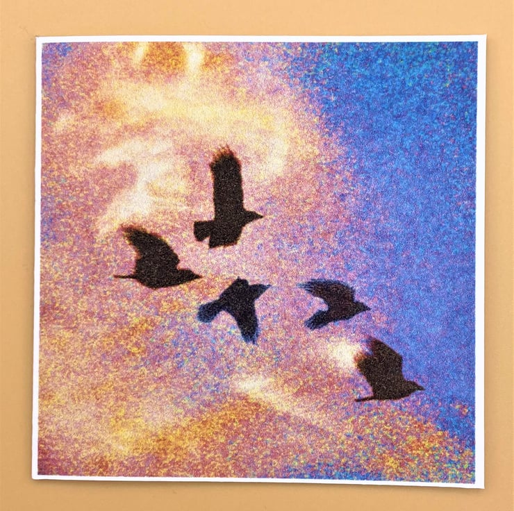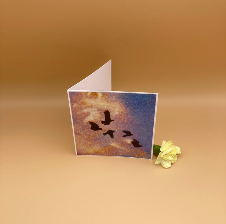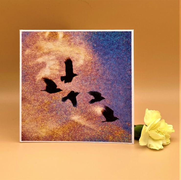 This blank Greetings Card shows Crows flying through a rainbow coloured sky & has no message inside - it's a charming way to send your own greetings. Taken from one of my original designs the rainbow clouds are bright and uplifting. This card comes in several variations (see other listings) and there's also a 'best buy' value pack containing 4 different colourways.
