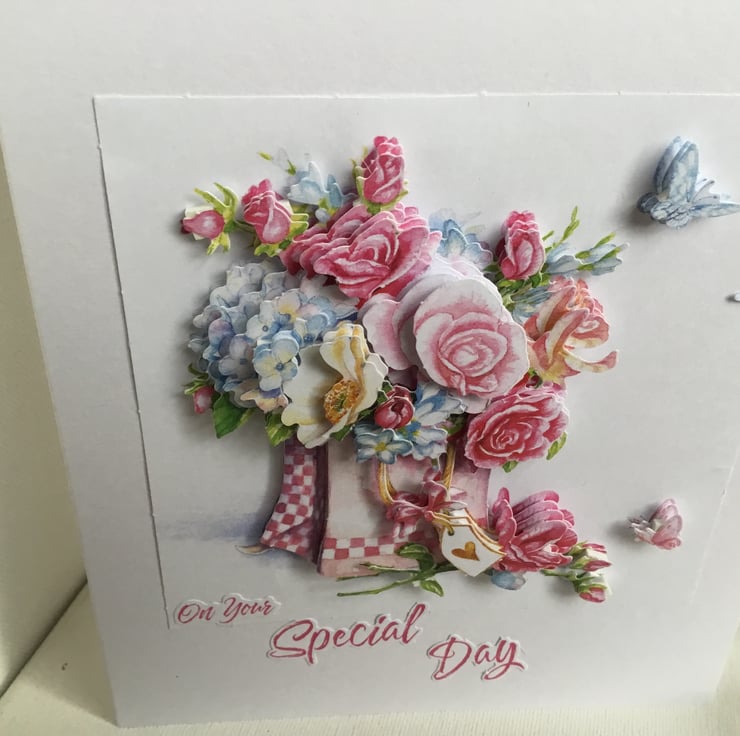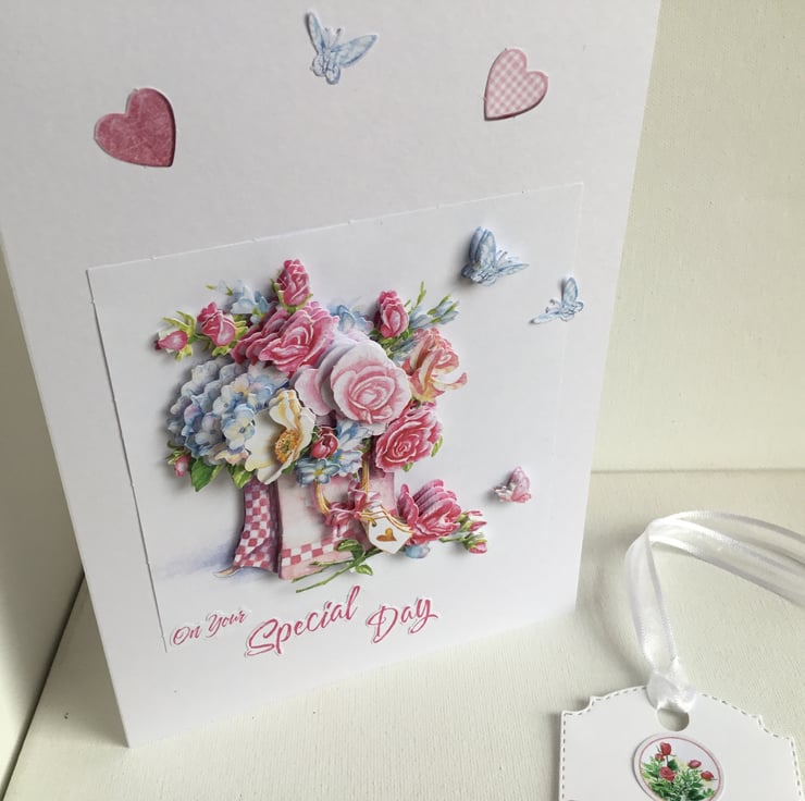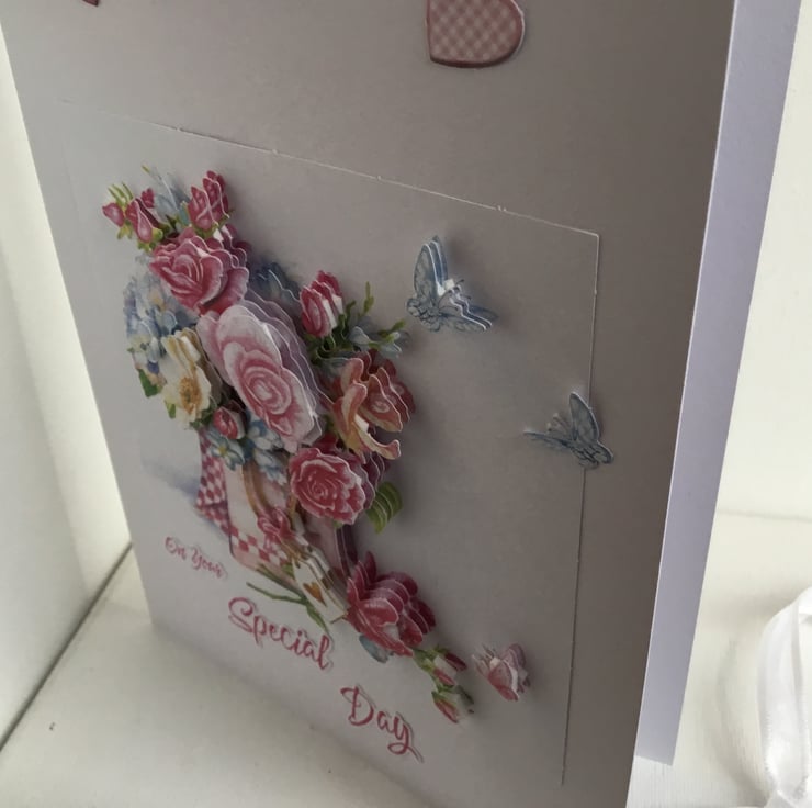 A beautiful Birthday card which has loads of decoupage flowers floating with hearts and butterflies.