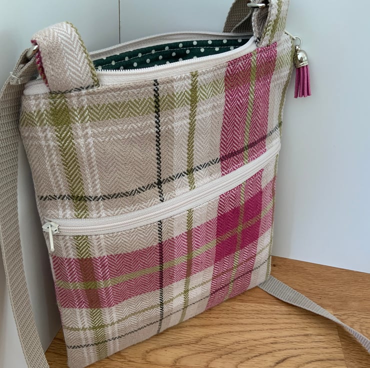 Handmade fully lined crossbody bag with zip fastening, front zipper pocket and adjustable strap. This bag is interfaced to give it structure and lined in cotton with a small slip pocket. Fitted with a nylon strap which is adjustable. Decorative tassel attached to top zip.