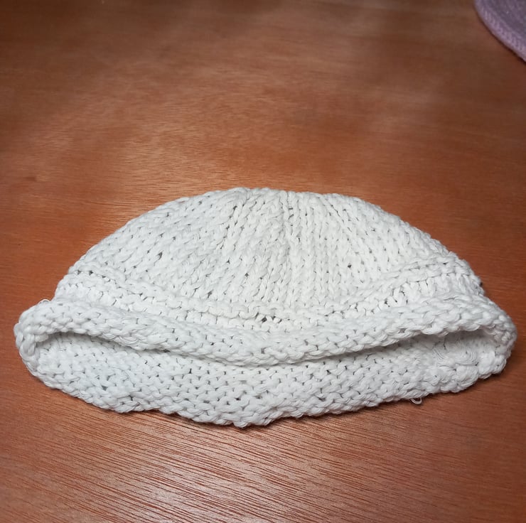 A pretty hand knitted beanie hat in a white cotton yarn . A lacy pattern is at the base of the hat and the rim is rolled over. The main body of the hat is stocking stiitch. The hat measures approximately 12 inches at middle of head.