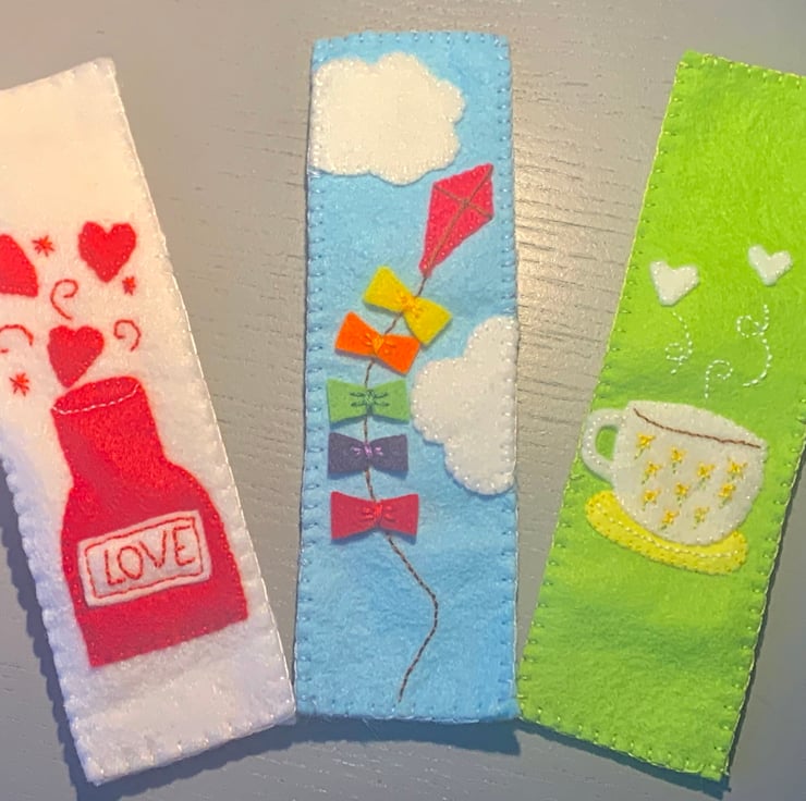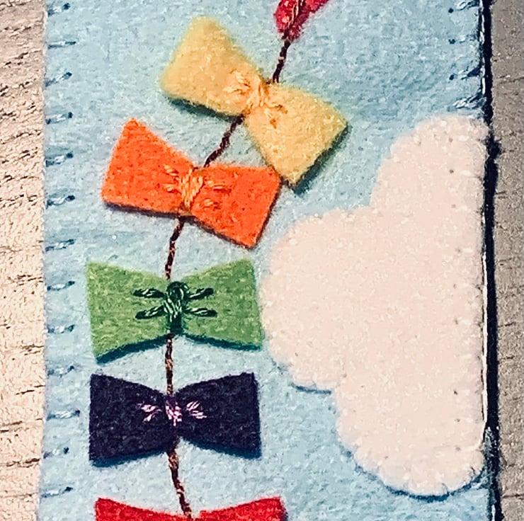 A felt embroidered bookmark to save your page! A colourful felt kite flying through the clouds graces the front of this bookmark. Would make a lovely little gift, an addition to a child’s party bag or just a little gift for yourself.