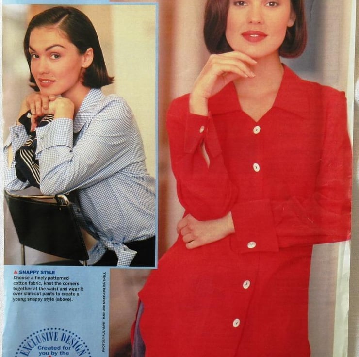 A multi-size sewing pattern for a woman's fitted shirt in sizes 10 -18 (bust 32.5"/83 cm - 40"/102 cm, Prima February 1995). The long-sleeved fitted shirt has a slight v-neck with a collar, button fastening and sleeves pleated into buttoning cuffs. It has shaped back and front and can be worn loose or tied at the waist. It is dated February 1995. Knitting charts are also printed on the pattern sheet, but I don't have any details of the knitting projects.