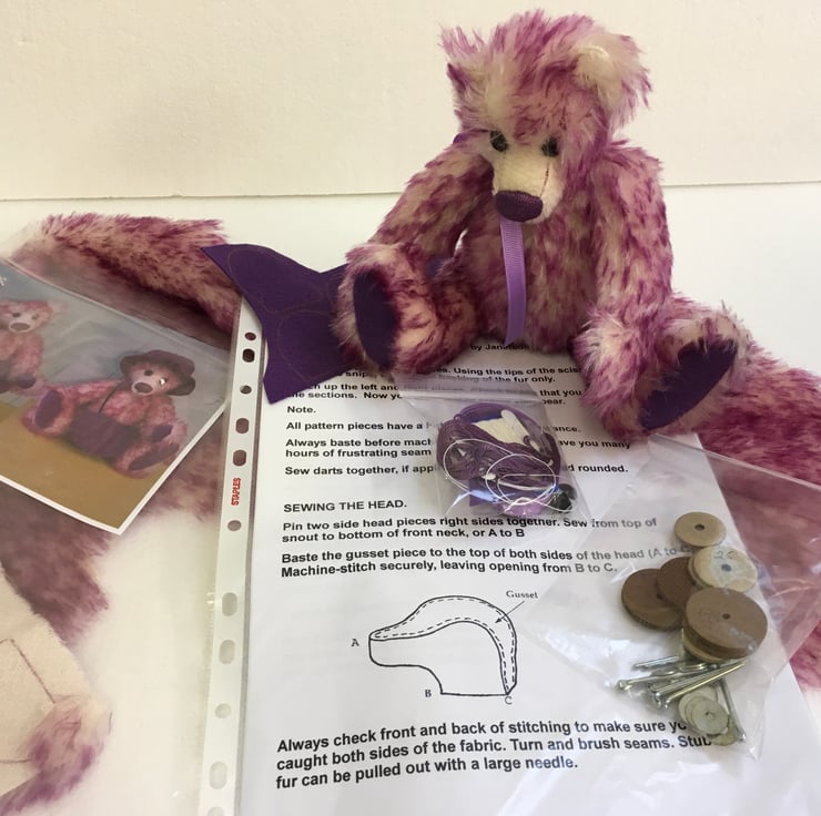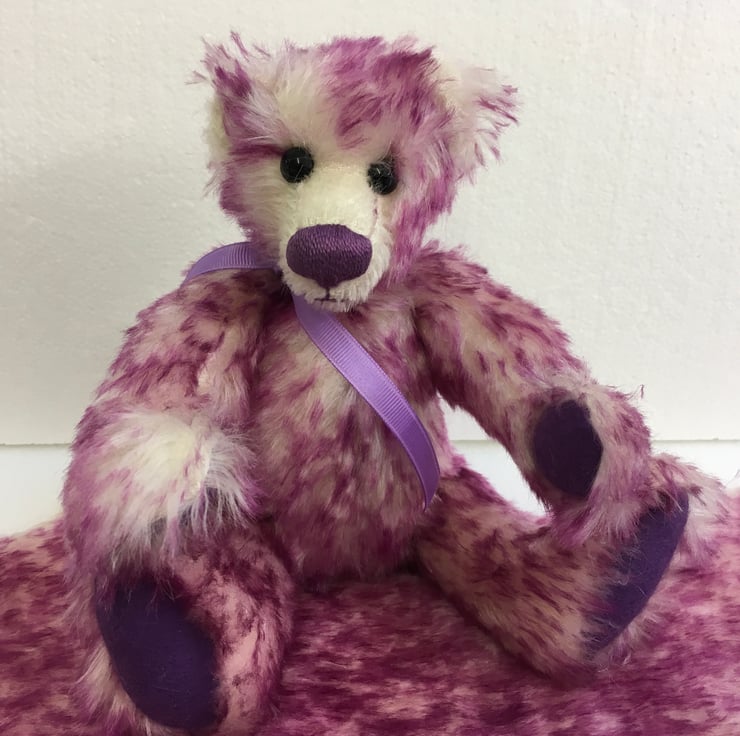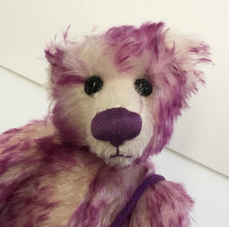 She has black glass eyes and a purple, hand-embroidered nose to match her purple felt paw and foot pads. She has traditional split pin joints and is filled with polyester stuffing.