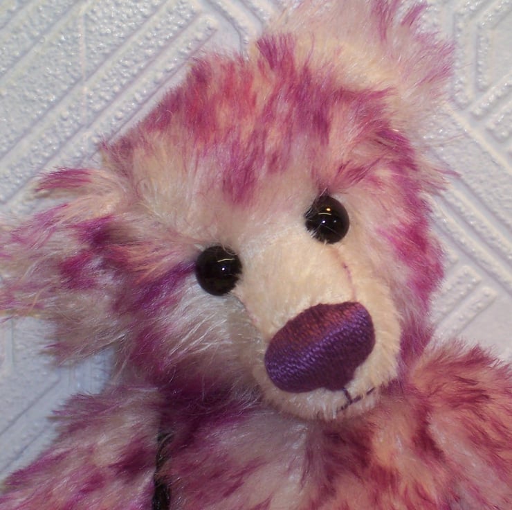 I made this 10” tall funky bear with the wobbly head in Tipped, dense Mohair by Helmbold in Turkish Delight.