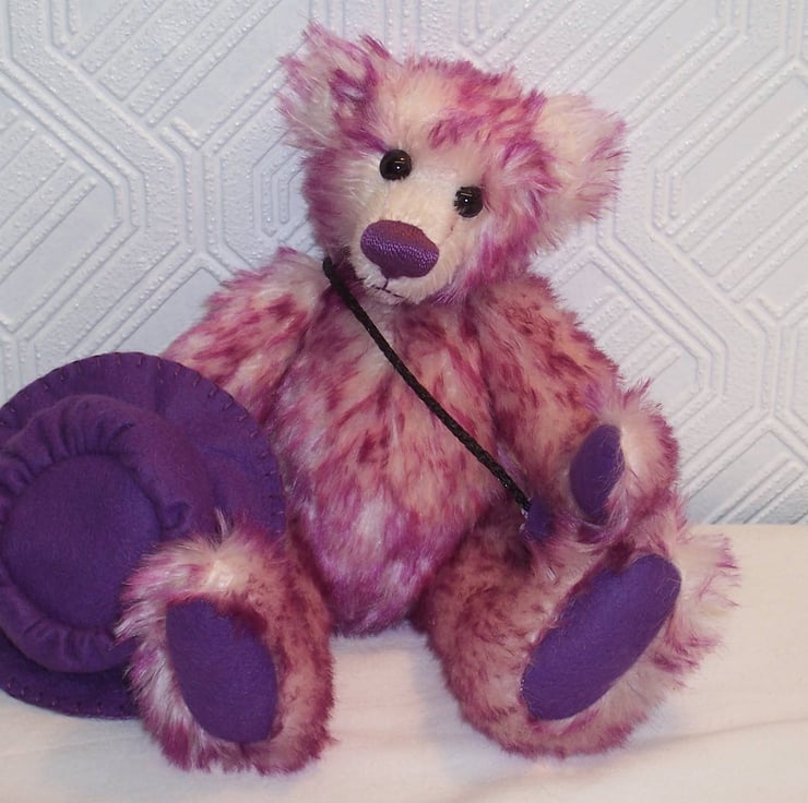 She has black glass eyes and a purple, hand-embroidered nose to match her purple felt paw and foot pads. She has traditional split pin joints and is filled with polyester stuffing.