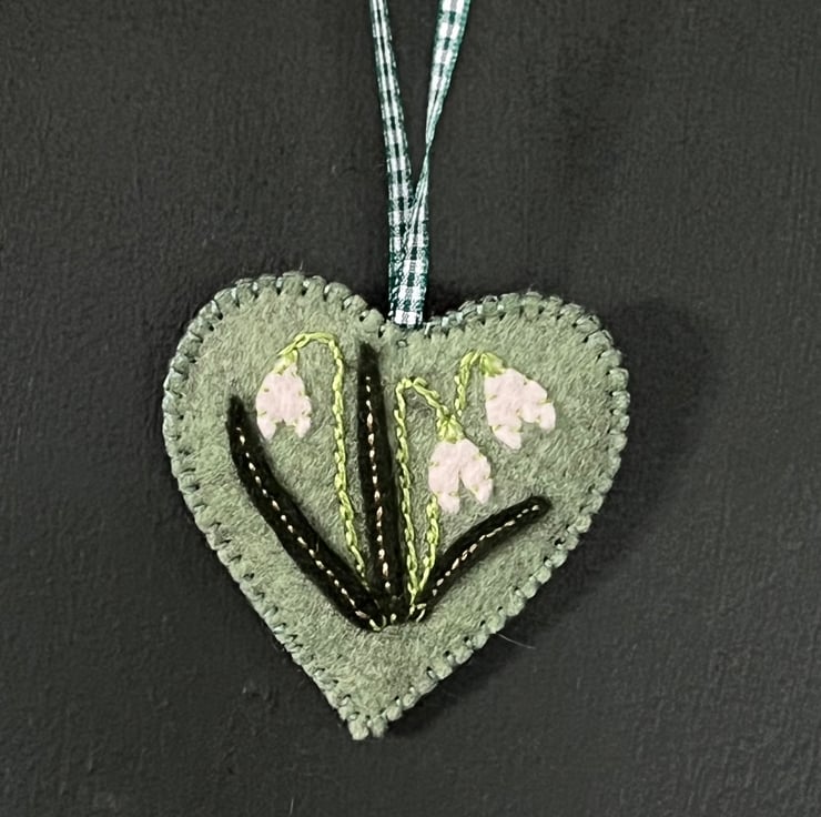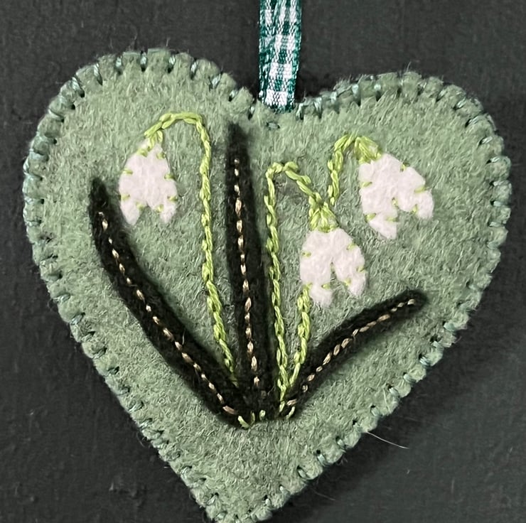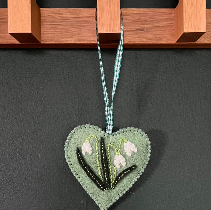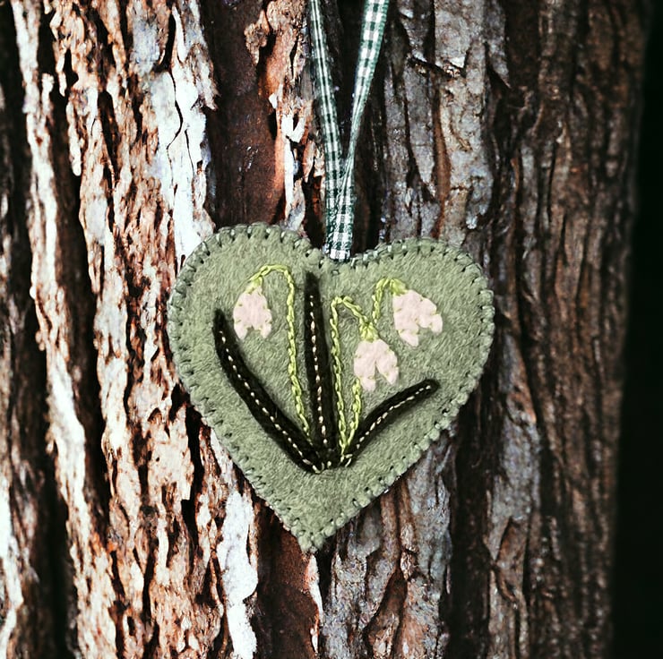 This hanging felt heart decoration shows the first signs of spring. It's decorated with appliqued snowdrops ,leaves and embroidered stems. Made from high quality 100% wool felt it will be a gift that will be loved for a long time.