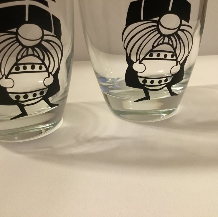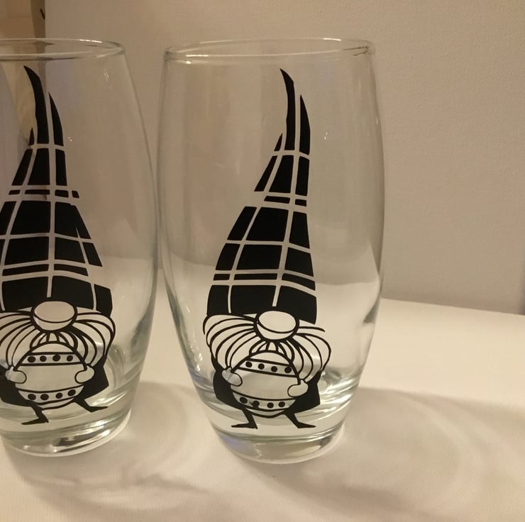 Hi ball glass with a gonk or gnome holding an Easter egg.