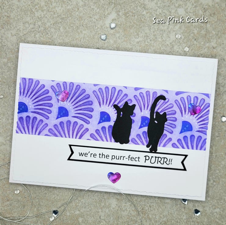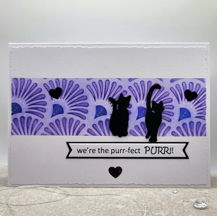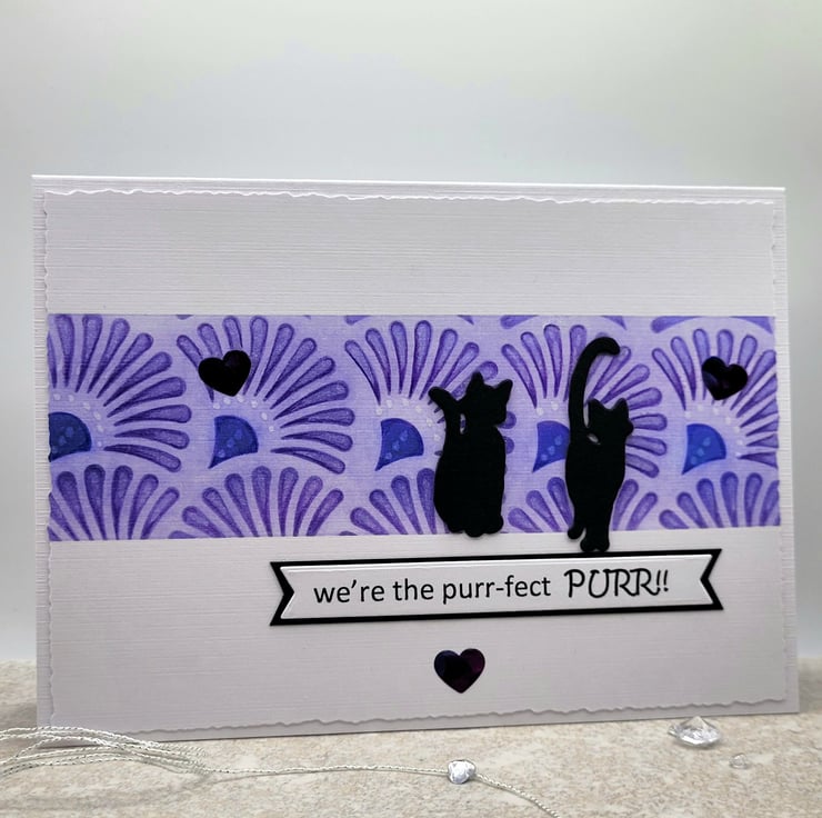 An Anniversary or Valentine Card with we're the purr-fect PURR!! Perfect if your partner is a cat lover! Two black cats, die cut in silhouette against a softly stencilled blue and purple art deco banner. Designed and handmade in my craftroom, this is a one-of-a-kind card.