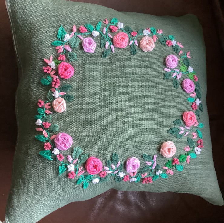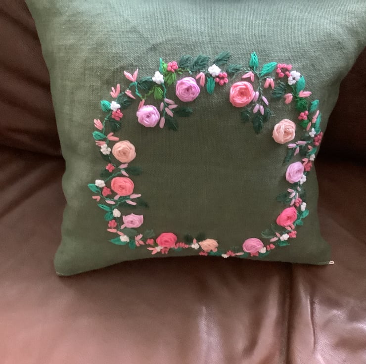 Hand made on a green material using coloured threads have embroidered these flowers.