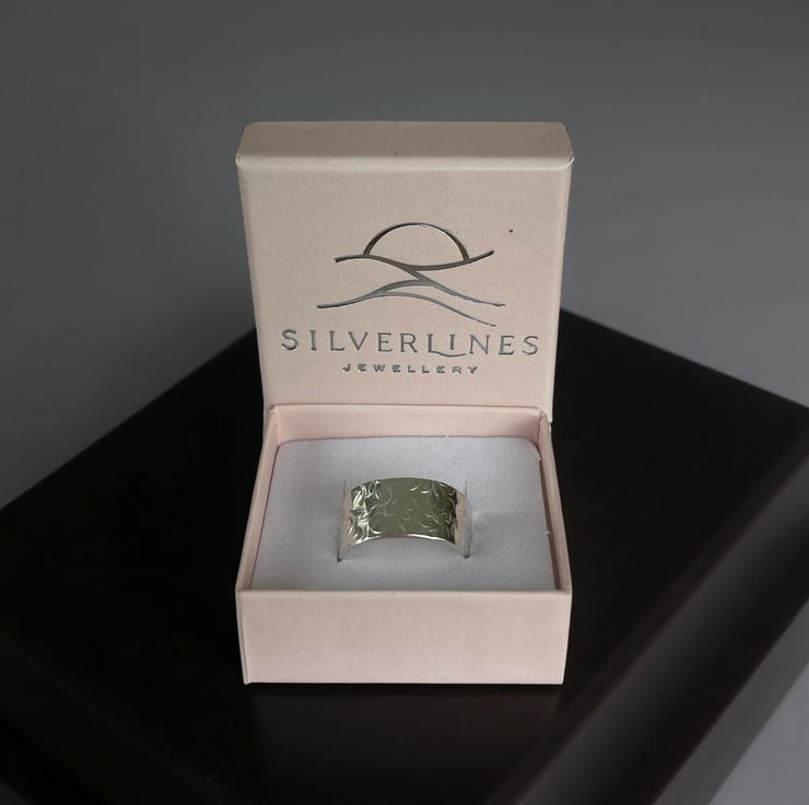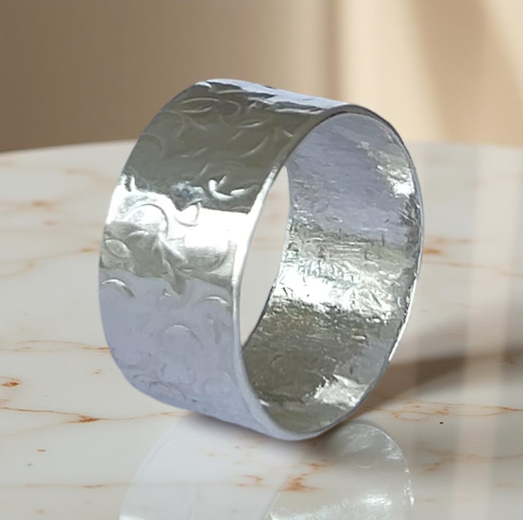 Handcrafted sterling silver ring a unique Bohemian style, this unisex silver wide band ring is made with eco friendly, recycled sterling silver and features a delicate patterned finish. At 10mm wide, it makes a great his and hers ring, perfect for any occaision. Handmade in Woolacombe, North Devon. Artisan Jewellery.