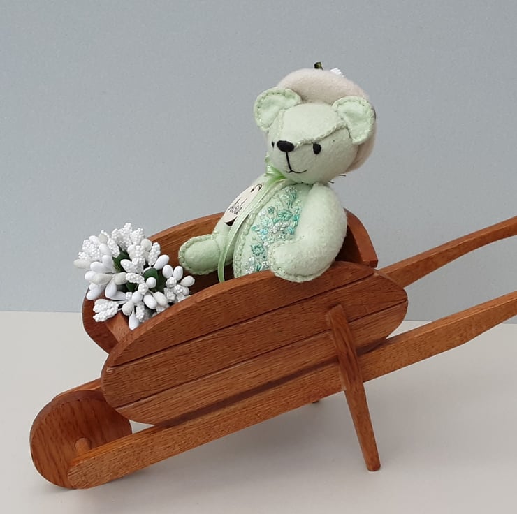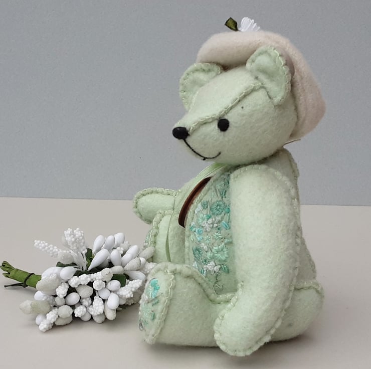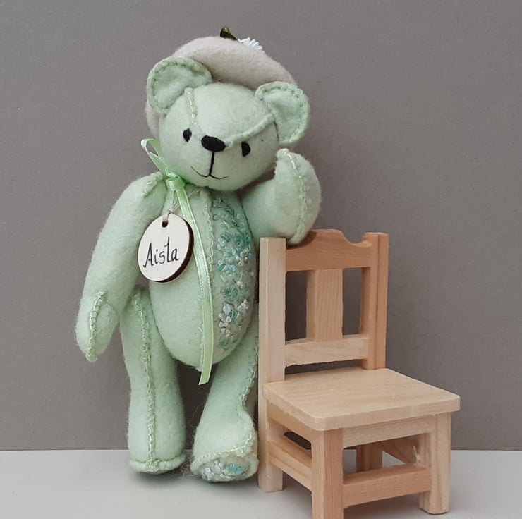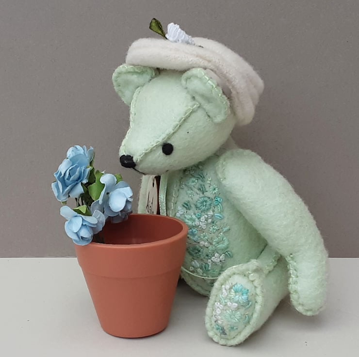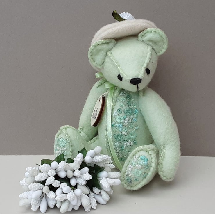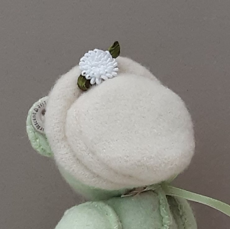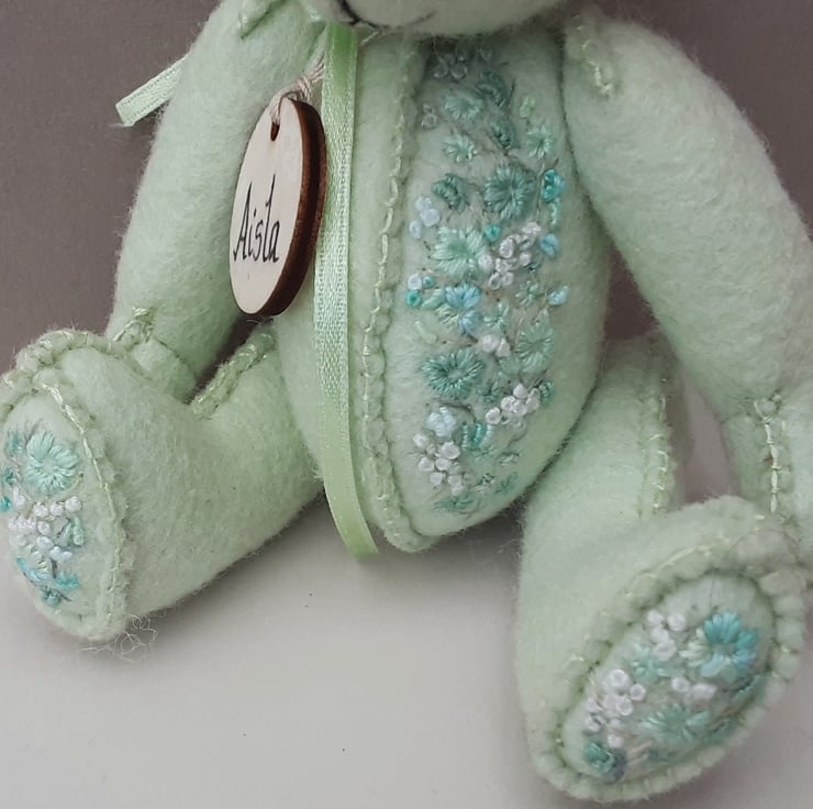 Aisla was created from quality wool felt in mint green, she has hand embroidered flowers to one side body front and her foot pads in pale greens to compliment and match her fabric.