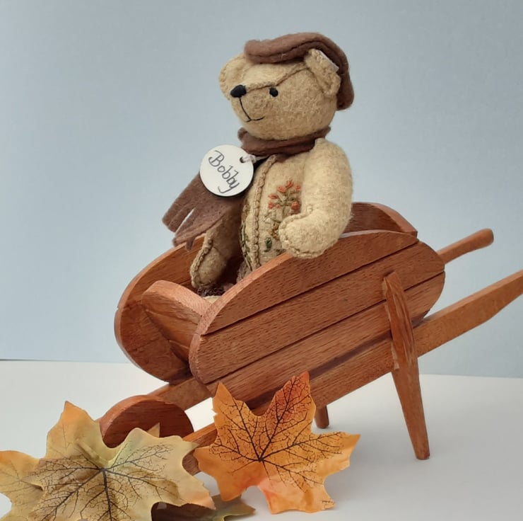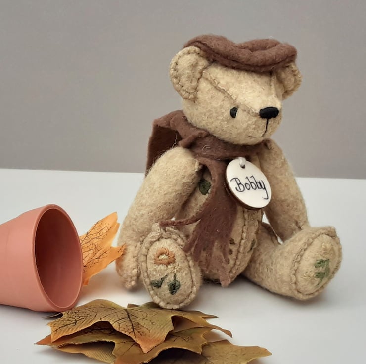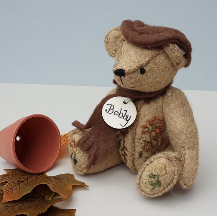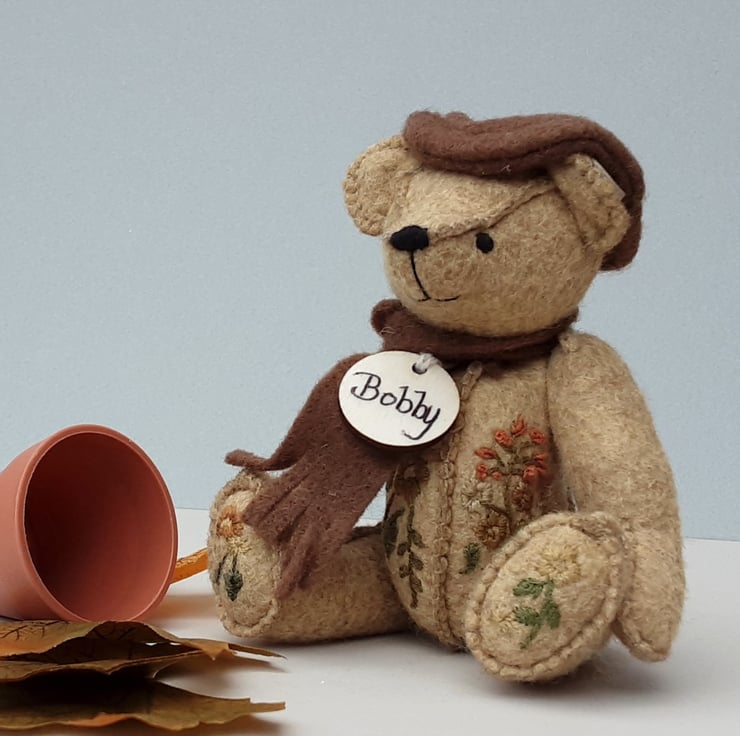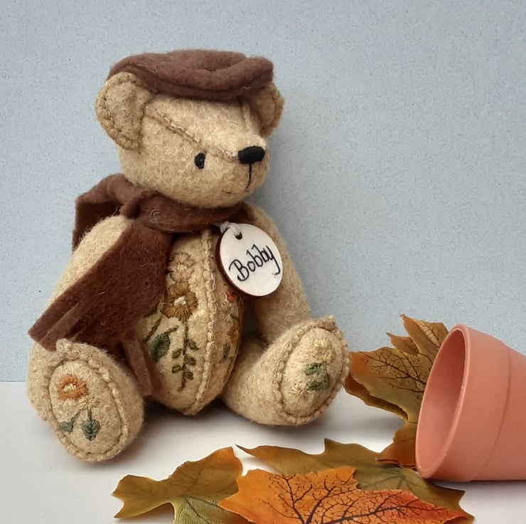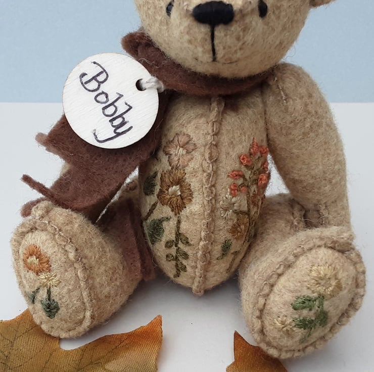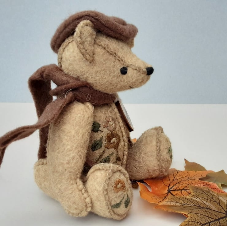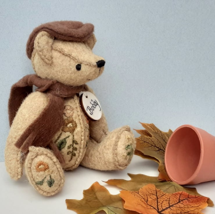 Bobby was created from quality wool felt in harvest gold, he has hand embroidered flowers and leaves to his body fronts and foot pads in lovely deep Autumn golds, greeens and rusts.