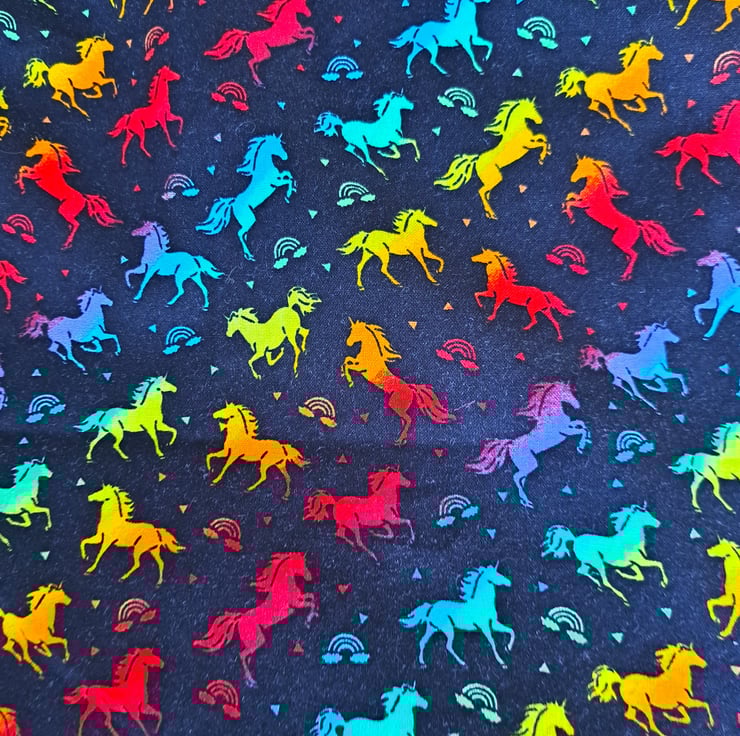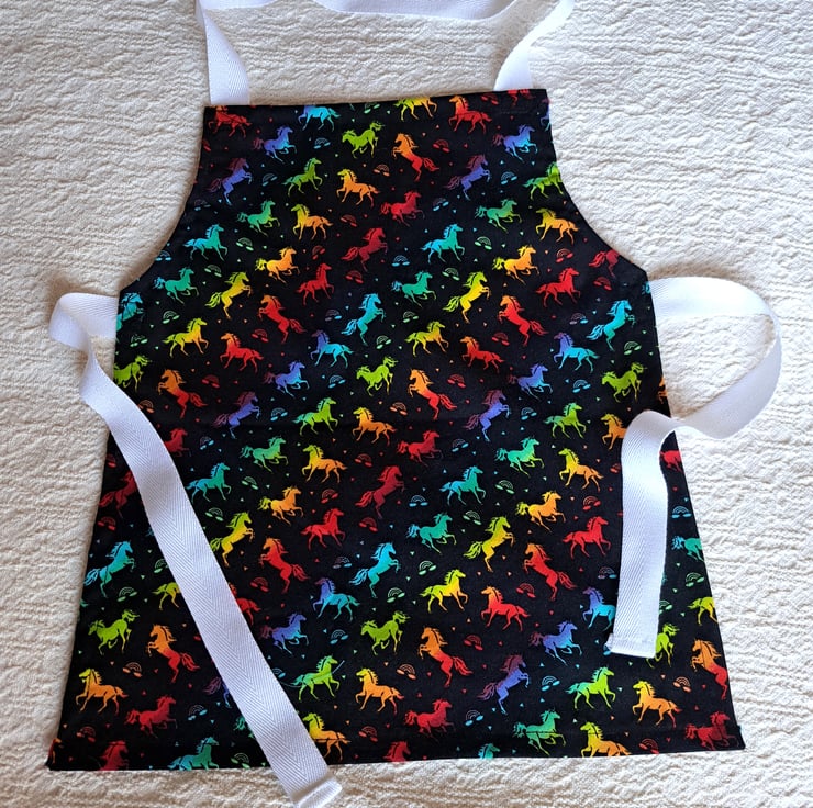 This lovely black apron is printed with diagonal rows of tiny rainbow horses, their colours in accurate order. The apron is all cotton, with white acrylic straps. It measures 16" (40cm.) from neck to hem and 14" (37cm.) at the widest point, and will fit a child between two and six years approximately. It is machine washable.