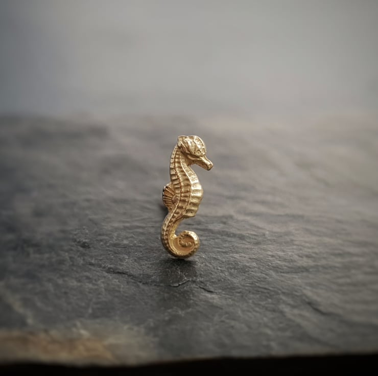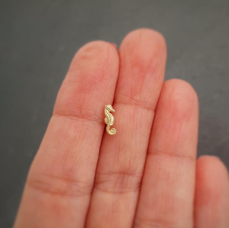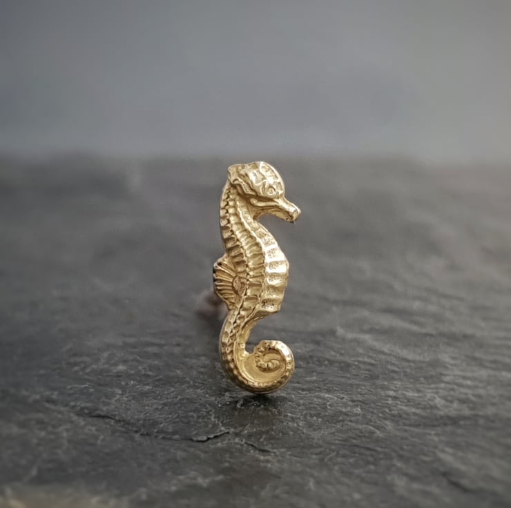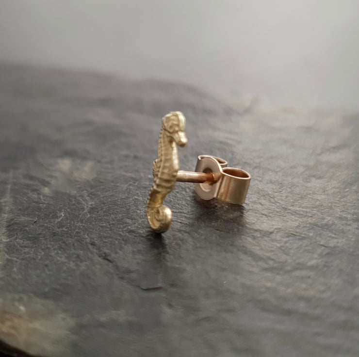 Each of these beautifully detailed little gold seahorse studs is individually handmade in 18 carat recycled yellow gold with 9 carat gold ear post and scroll. Due to the detailed design of this earring, it takes two hours to complete just one. This little seahorse is perfect to wear in the upper earlobe and would make a gorgeous addition to a beach wedding outfit.