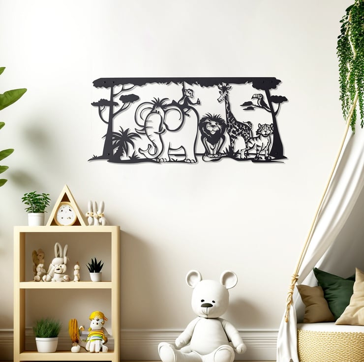 Introducing our adorable jungle animal metal wall ar the perfect addition to any nursery decor. Crafted with the utmost attention to detail, this high-quality piece showcases the cutest jungle animals in a captivating design. Whether you're creating a safari-inspired nursery or adding a touch of whimsy to your child's room, this metal wall art is sure to impress.