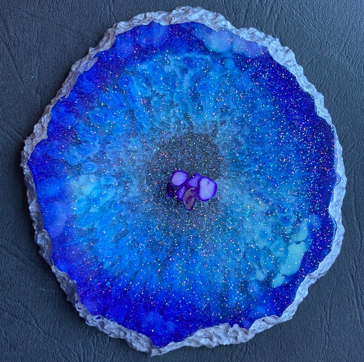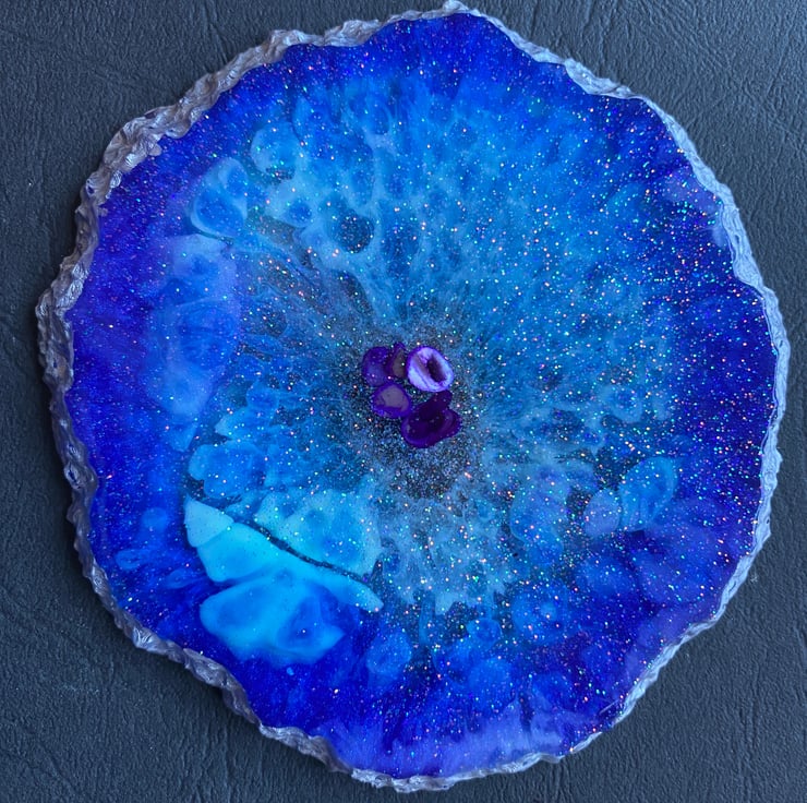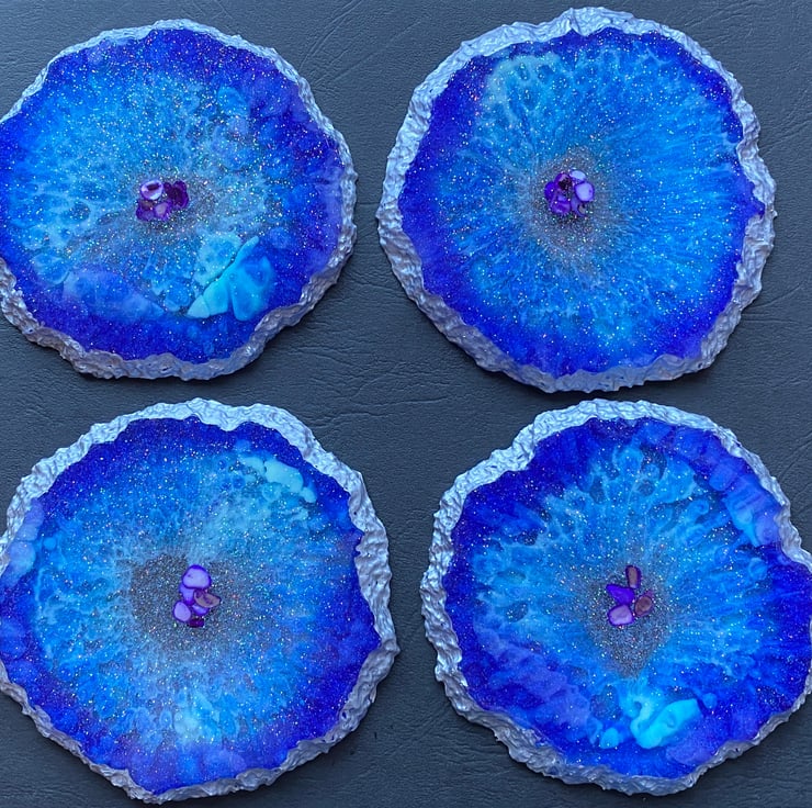 This is a set of 4 cobalt and turquoise blue geode stlye coasters. The cenre has purple albone shells and it is edged with metallic silver acrylic paint. Each one is made individually so none are identical due to the process involved in making them. They are approximately 10cm in diameter although they are irregularly shaped. If you would like me to make a set especially for you with your own colour scheme, I am delighted to help. It is sent via 2nd class Royal Mail, but can be sent sooner if required at additional cost. Thank for Looking xx