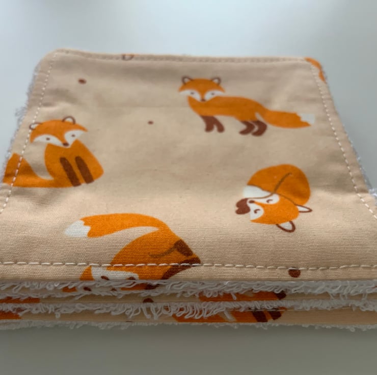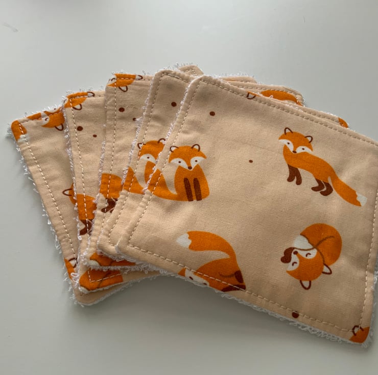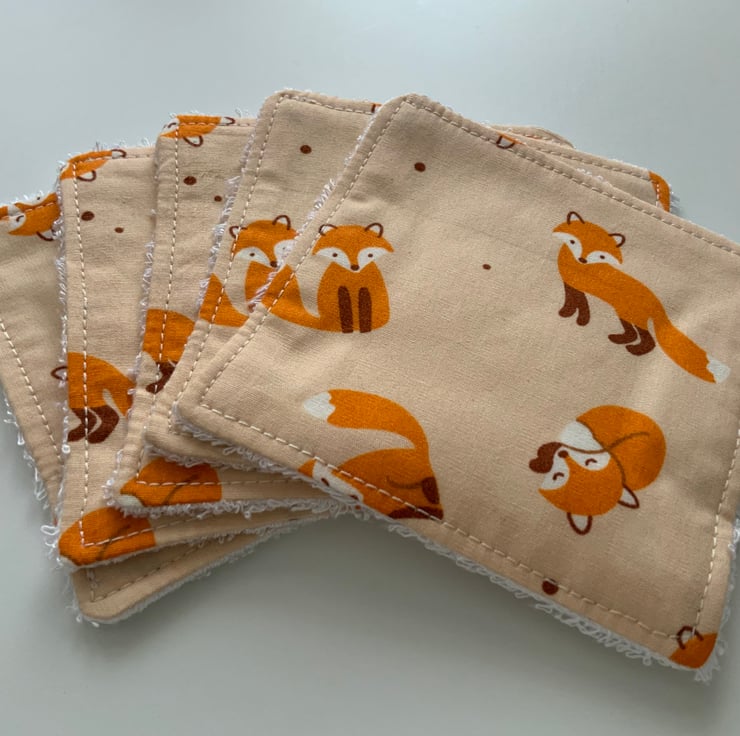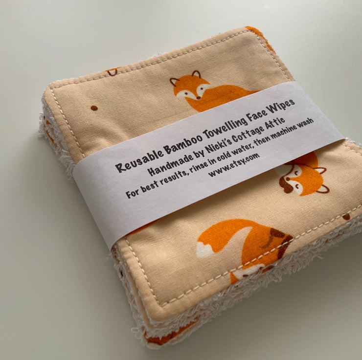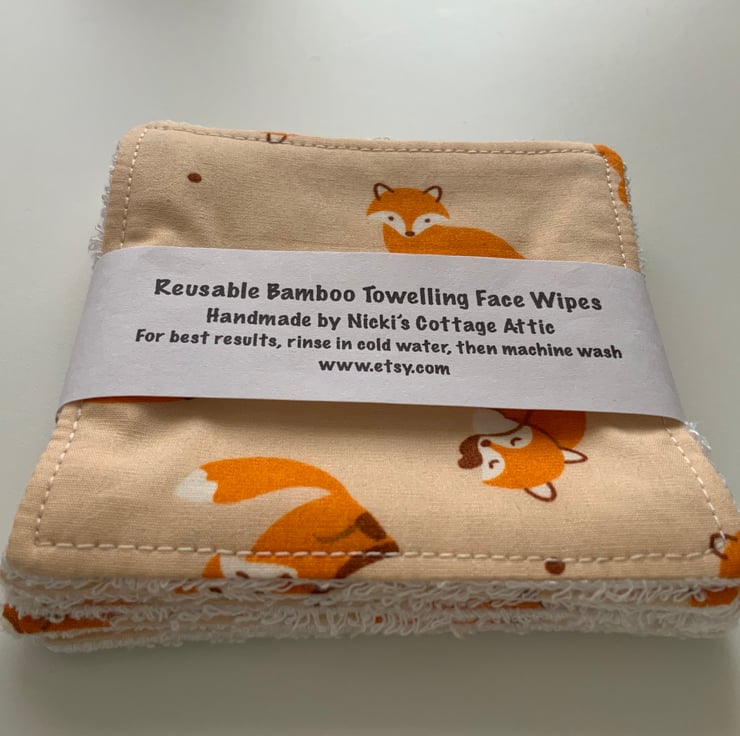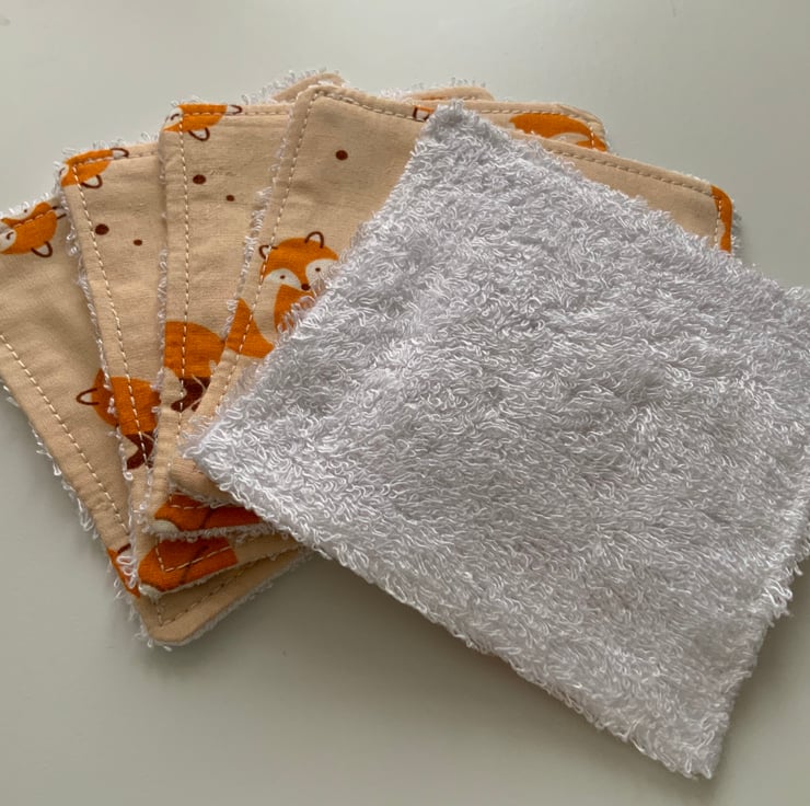 Reusable cotton bamboo face wipes, 100% patterned cotton with white bamboo towelling on reverse. Each pack contains five wipes.