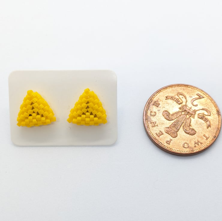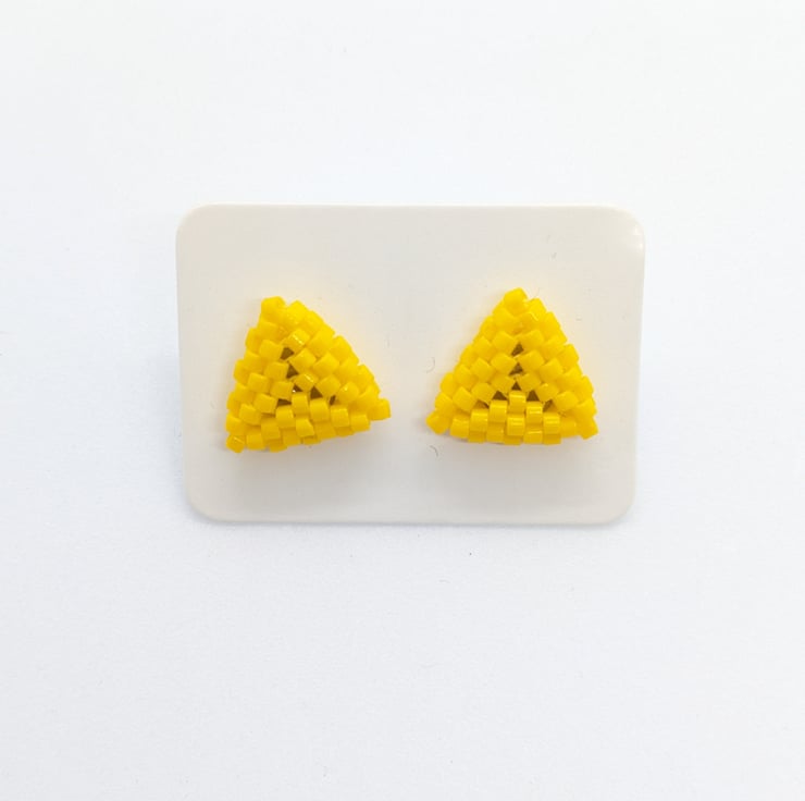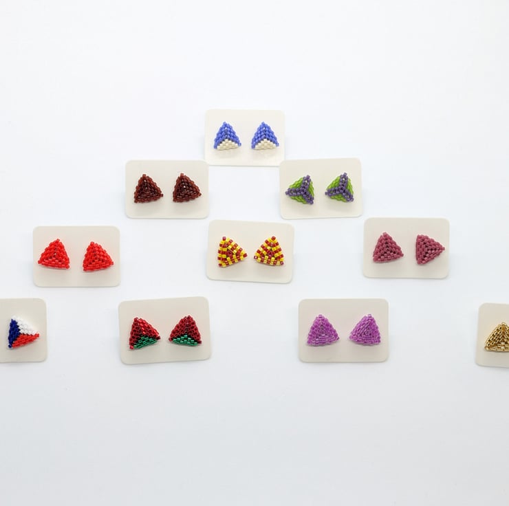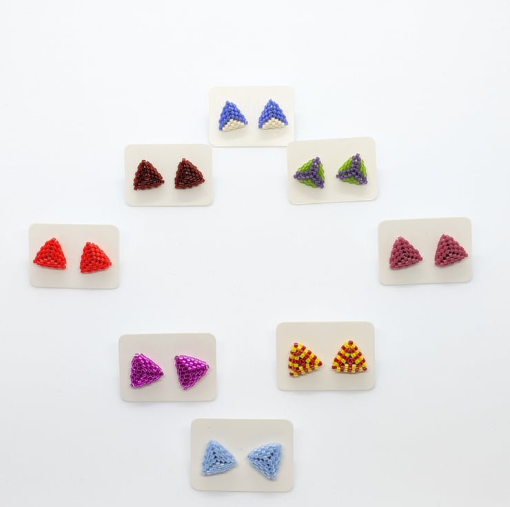 These beautiful triangular studs have been made by weaving tiny beads using a technique called peyote stitch.