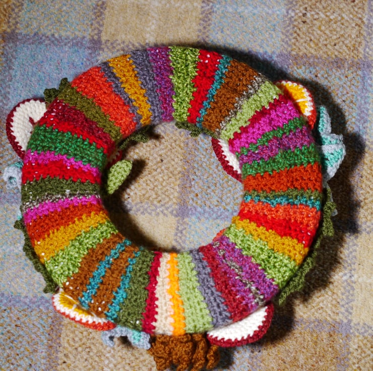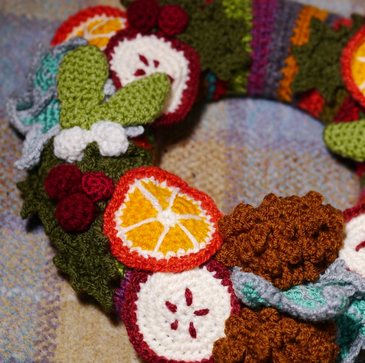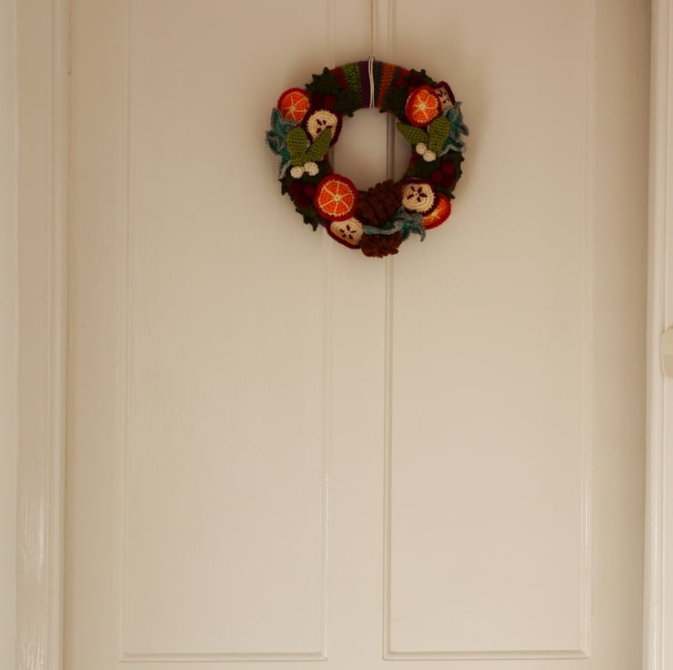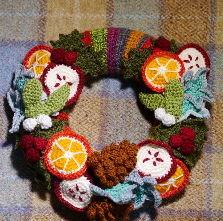 This beautiful crochet wreath made with dedication and care would be a lovely seasonal addition to any home. The 25cm (approximately 10inches) polystyrene wreath base is covered with a striped crocheted cover and the design is created using an abundance of crochet elements including holly leaves and berries, frosted ivy leaves, mistletoe pinecones and fruit slices in rich earthy hues, truly evocative of the season. A beautiful Christmas decoration to be cherished and used year after year. All elements are crochet by me and then hand stitched on to the base. Item made in a pet and smoke free home